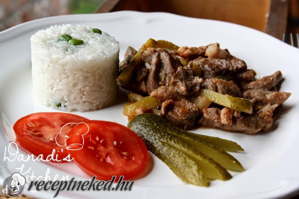 Ha a hús megpuhult hozzáadjuk az uborkát és a paradicsompürét és már kész is.
