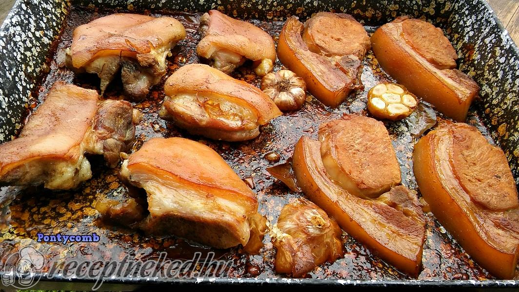 Egy tepsit kenjünk ki a zsírral, öntsük bele a bort, majd helyezzük bele az előzőleg befűszerezett húst és takarjuk le alufóliával. Helyezzük be előmelegített sütőbe, majd közepes hőmérsékleten bő egy óra alatt pároljuk puhára a húst (én légkeverésnél 160 fokon, 70 percig pároltam).