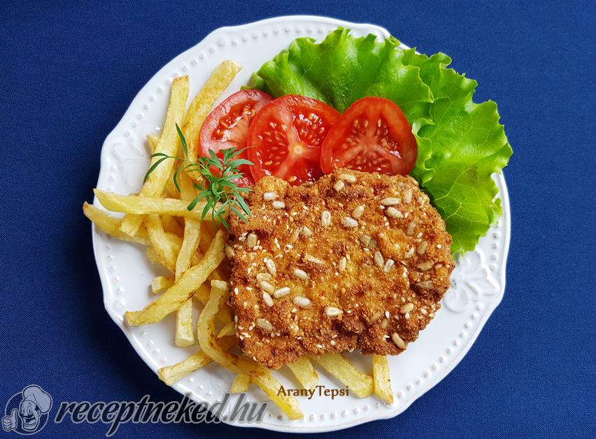 A húst szeletekre vágjuk, majd vékonyra kiklopfoljuk. Minden szeletet sózunk és borsozunk, majd megkenjük mustárral és ketchuppal. Egy tálban letakarva a hűtőbe tesszük 1-2 éjszakára. A panírozás a megszokott módon zajlik. A szeleteket először lisztbe, majd felvert tojásba, végül zsemlemorzsába mártjuk. A panírozás után mehet a forró olajba, ahol takarék lángon sütjük. Papírtörlőn pihentetjük, ahol […]
