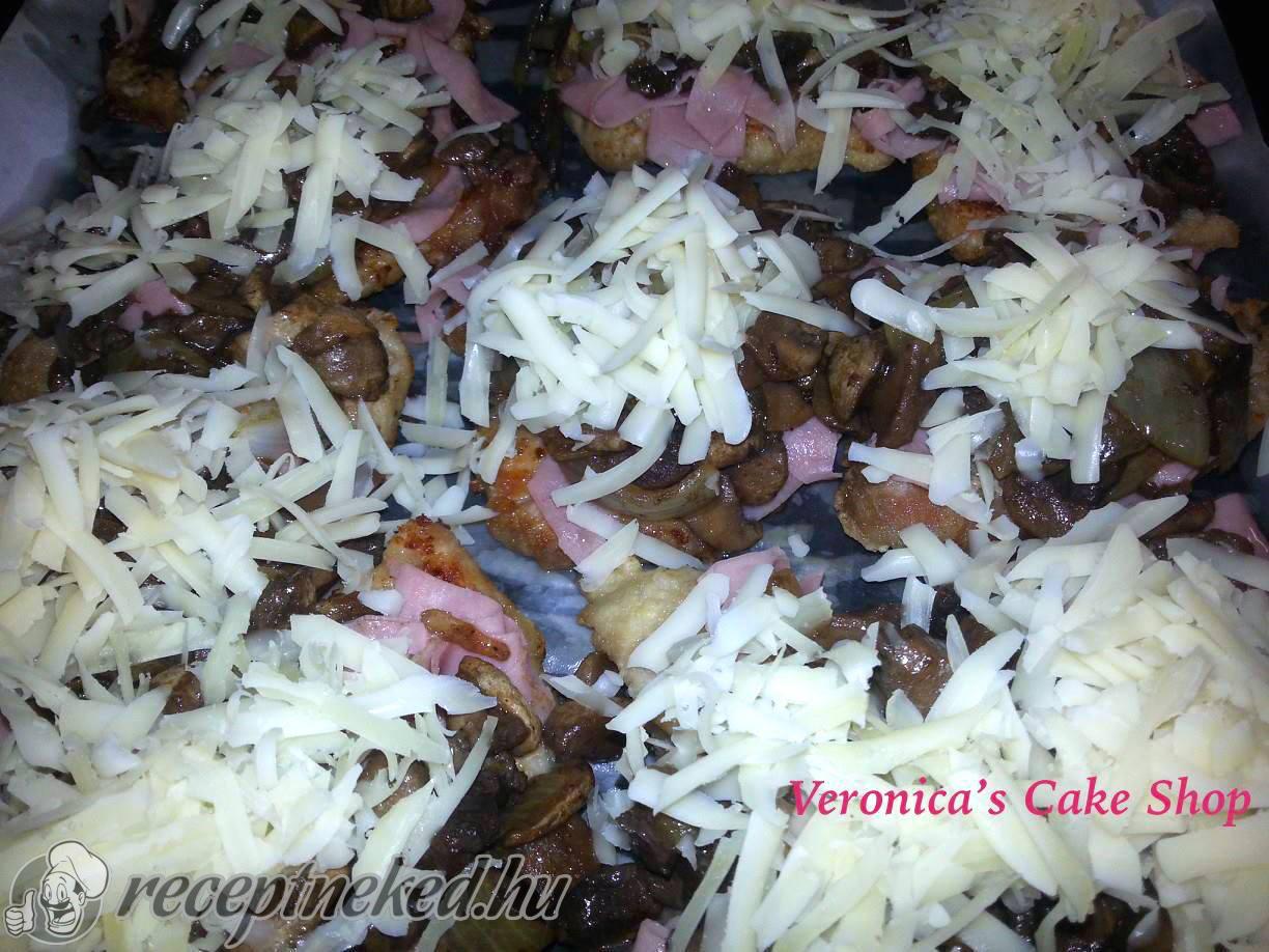 Sütőpapírral bélelt tepsibe szedjük a hússzeleteket, sonkát teszünk minden szelet húsra, majd a párolt gombát ráhalmozzuk.