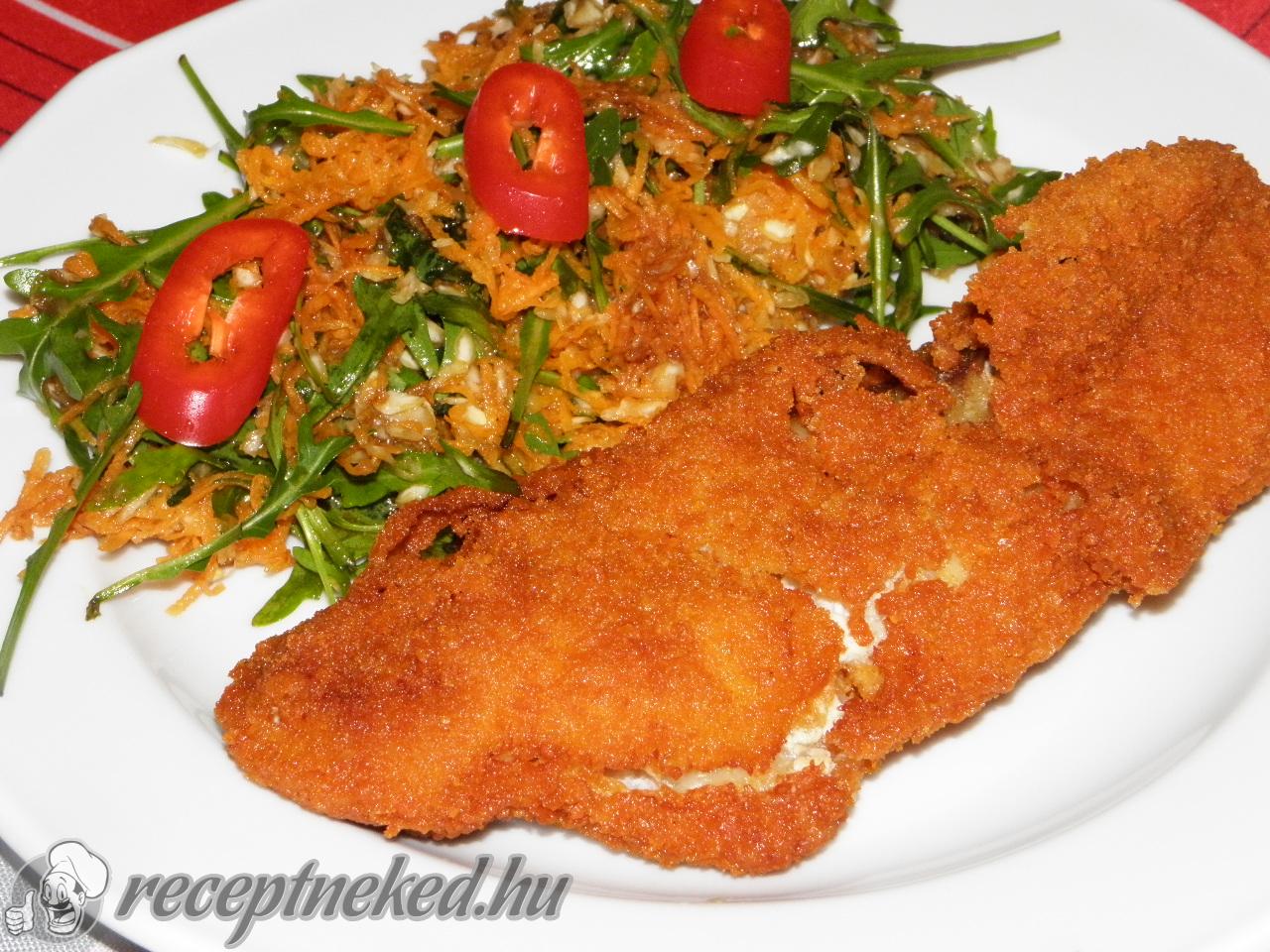 Először lisztbe, tojásba végül morzsába forgatjuk és olajban kisütjük.