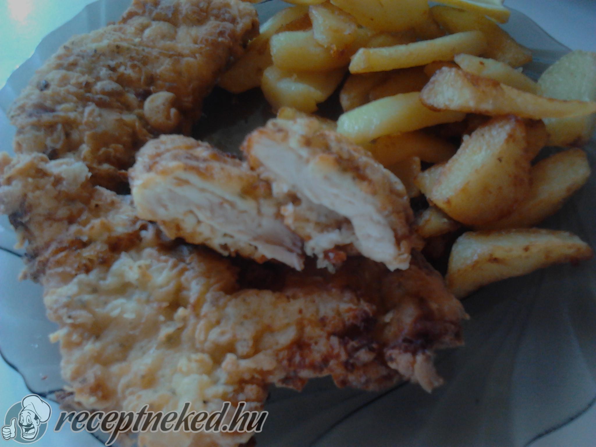 Az előzőleg besózott húst először forgassuk bele lisztbe, ezután alaposan forgassuk bele a tejfölös-fűszeres bundába, majd helyezzük bele az előzőleg felmelegített olajba.