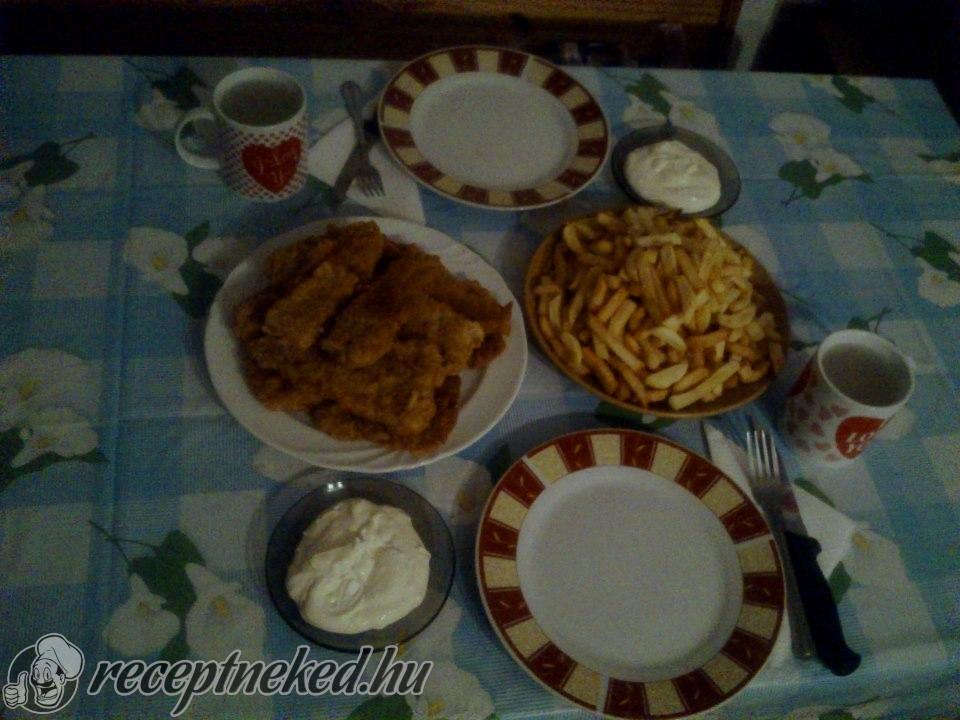 A hagymakarikát is süssük ki. A burgonyát hasábokra vágva időközben sós vízben főzzük meg, szűrjük le, majd tegyünk rá vajat és petrezselyemmel szórjuk meg. Ezután tálalunk is.