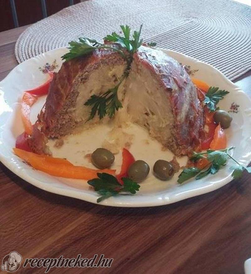 Baconszalonnával betakarjuk, fóliával letakarjuk, 30 percig sütjük, teljes sülés előtt 20 perccel levesszük róla a fóliát, és szép pirosra sütjük.
