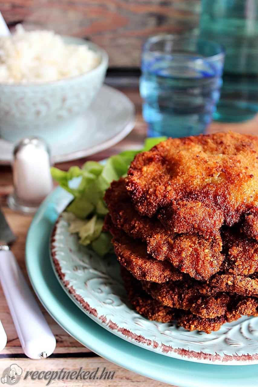 A húsos masszából lisztezett kézzel kiveszünk keveset és a tenyereink között ellapítjuk. Lisztbe forgatjuk (ha szükséges, akkor még itt is tudunk a formáján alakítani), tojásba mártjuk, majd végül a zsemlemorzsába forgatjuk mindkét oldalát. A megadott mennyiségből 6-8 szelet hús süthető, attól függően, hogy mekkorára formázzuk és milyen vastagra hagyjuk.