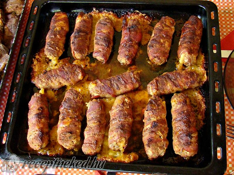 Szorosan beletekerjük 1-1 szelet baconbe, és zsírral, vagy olajjal kikent tepsibe helyezzük.