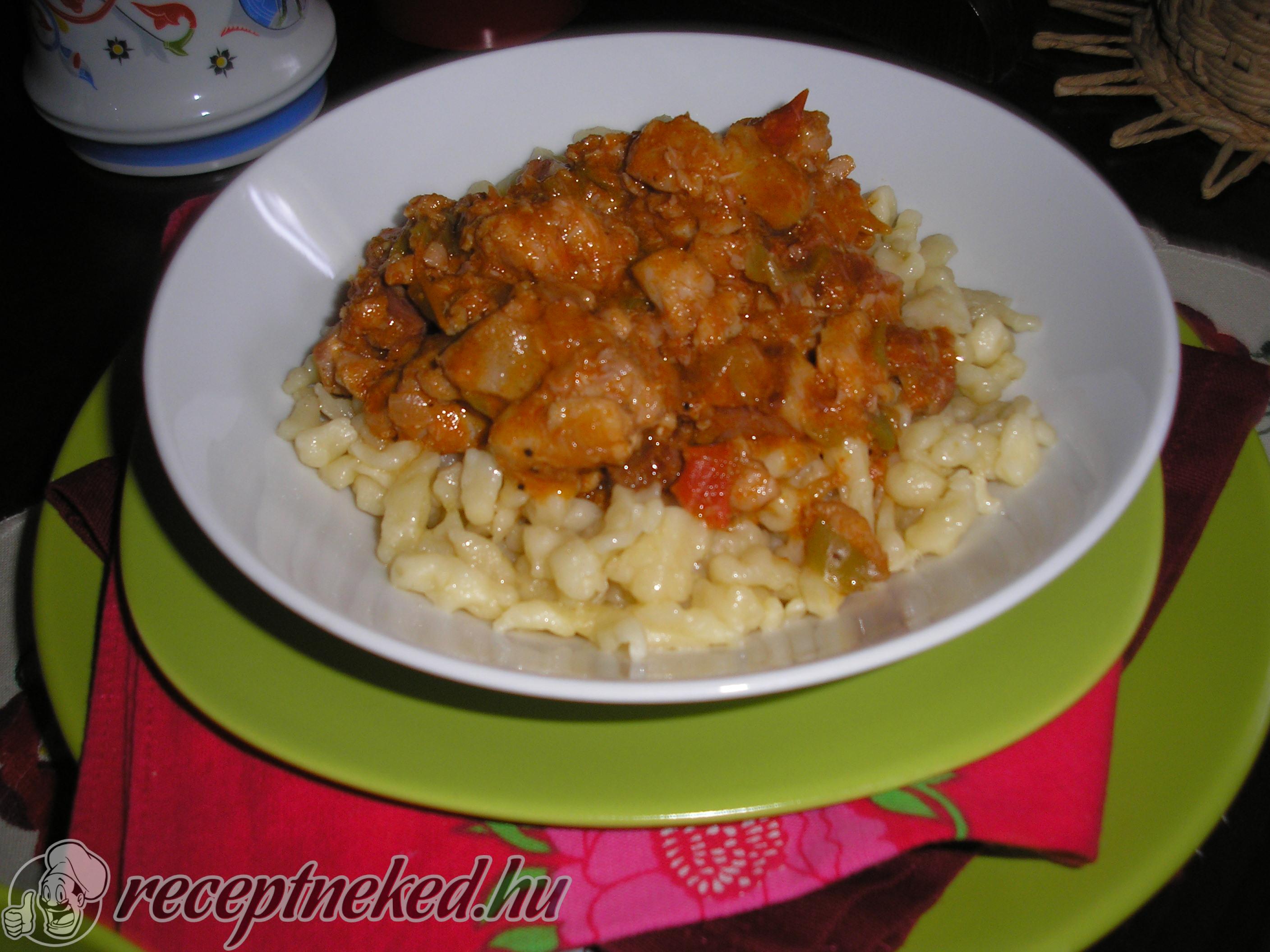 A vöröshagymát vágjuk apró kockákra. Az előkészített húst 2 cm élhosszúságú kockákra vágjuk, a paprikát és a paradicsomot úgyszintén.