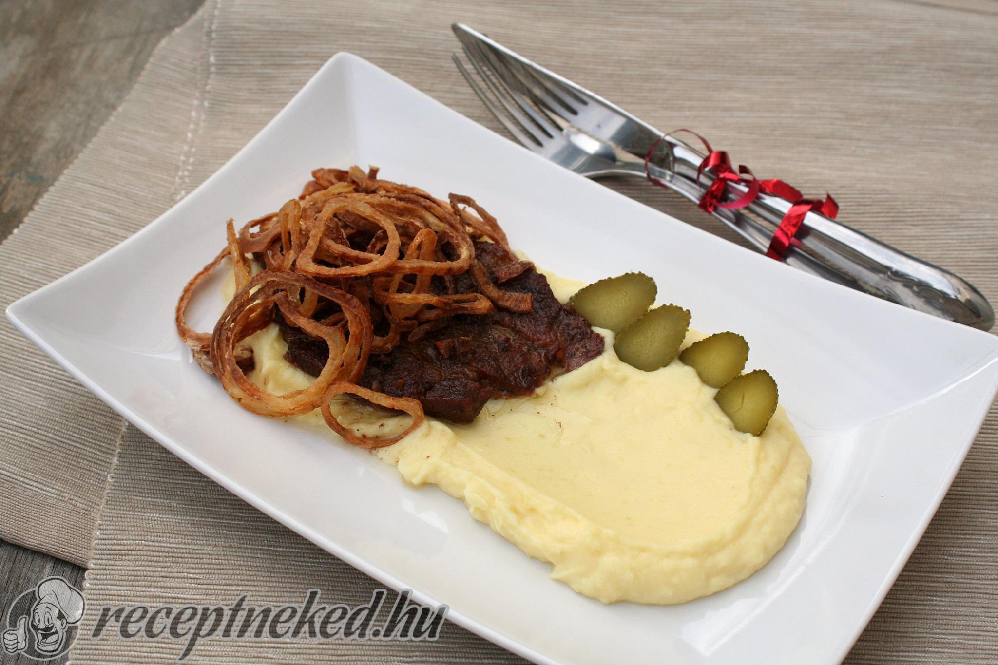 Az elkészült húst a burgonyapürével és a hagymával tálaljuk.