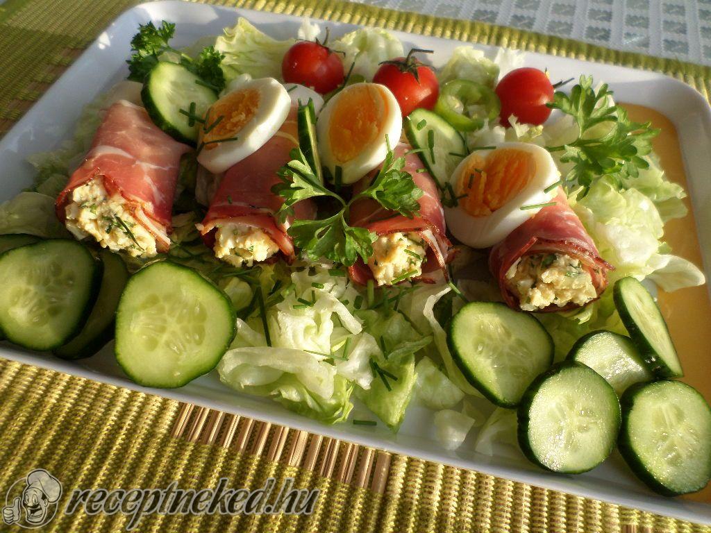 Tálaláskor a tányérra sonka szeletet, töltött tojást, kaliforniai paprika szeleteket, kovászos uborka szeleteket és sajtot teszünk.