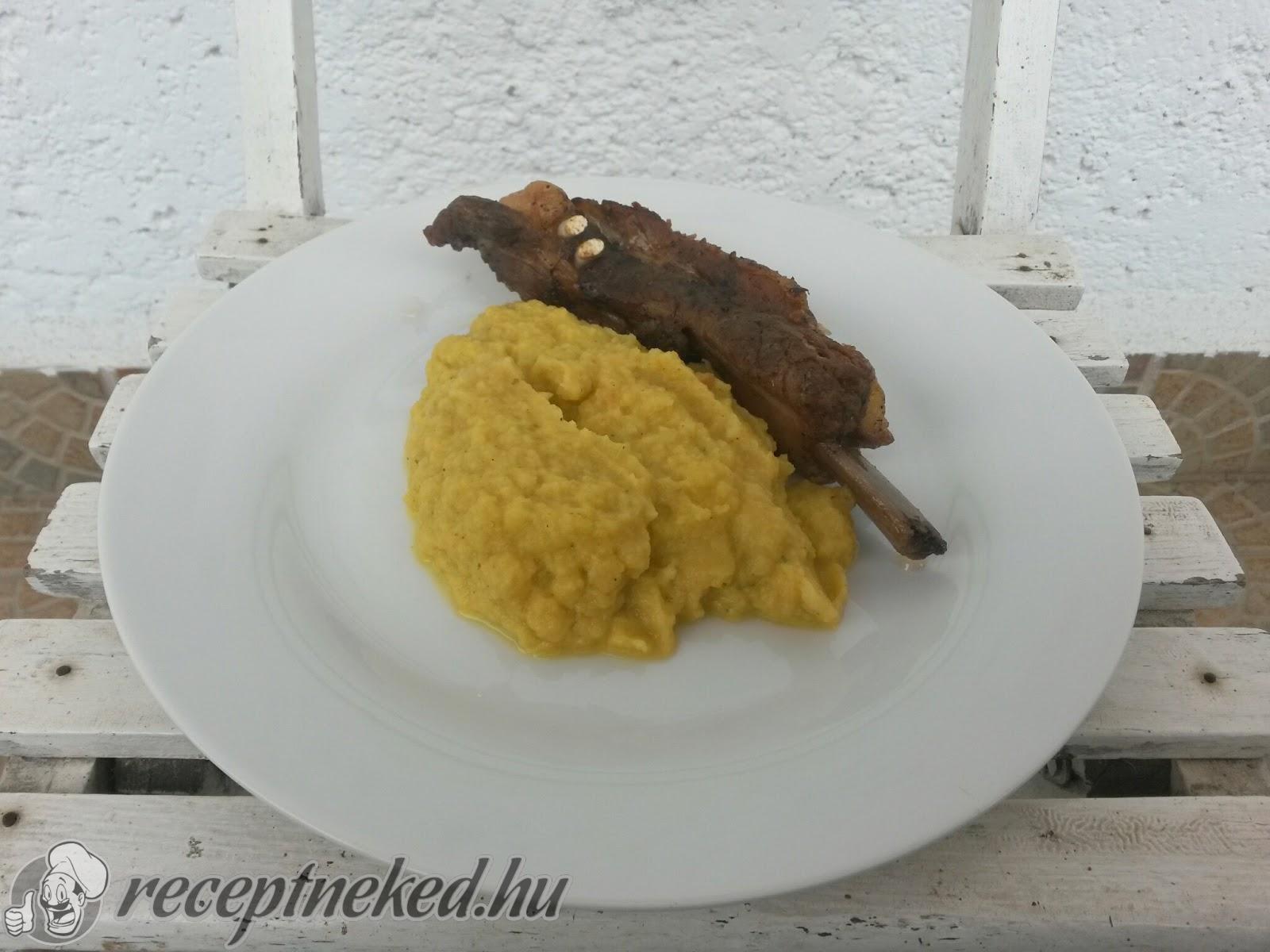 A püréhez felkockázom a répát és a zellert. Olvasztott margarinon párolom kicsit, majd felöntöm annyi vízzel, ami éppen ellepi. Petrezselyemzöldet tépkedek bele. Sóval, borssal, szerecsendióval ízesítem. Ha megpuhultak a zöldségek, botmixerrel pürésítem.
