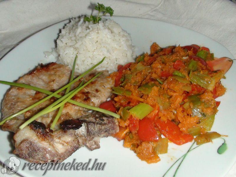 A húst a felforrósított olajon, mindkét oldalukon 5-5 percig sütjük, majd áttesszük egy másik edénybe és melegen lefedve tartjuk. Visszamaradó zsírjában, nagy lánggal a zöldségeket 3-4 percig pirítjuk.