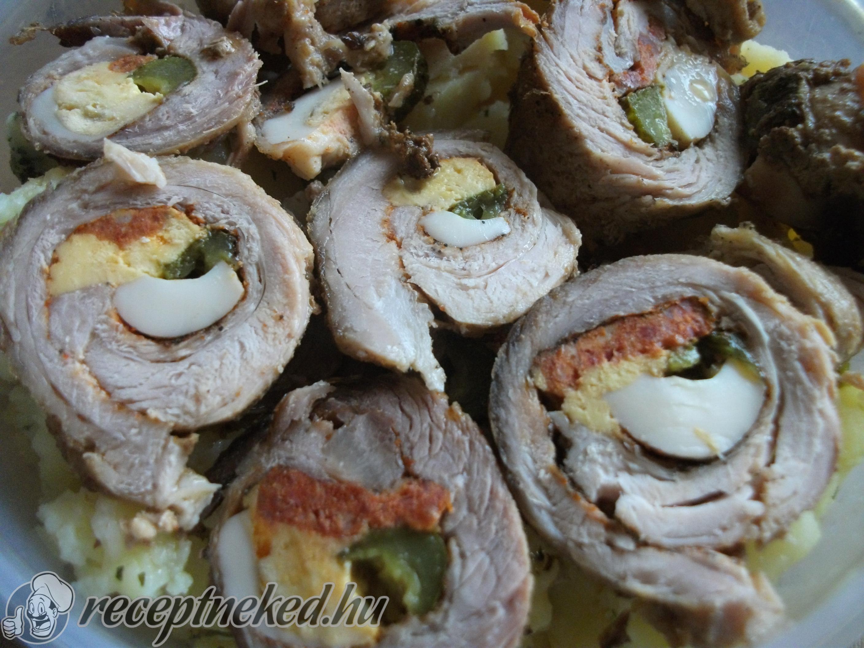 Minden hússzelet közepére teszünk egy karika kolbászt, mellé egy cikk főtt tojást, egy fél csemegeuborkát és egy szál rozmaringot. A húst szorosan feltekerjük, majd fogpiszkálóval rögzítjük.
