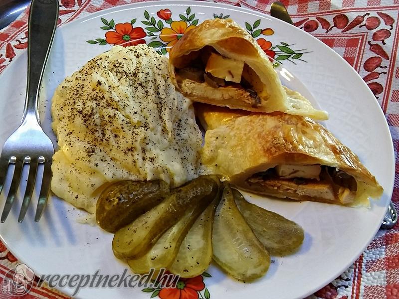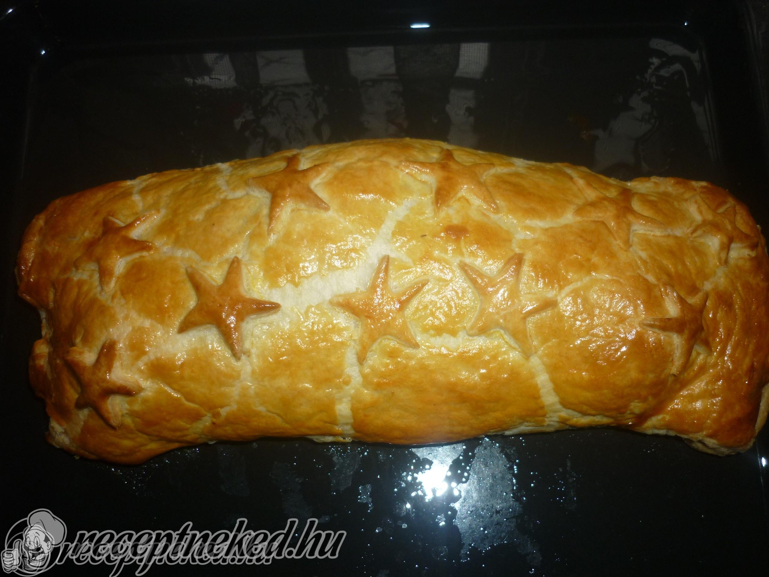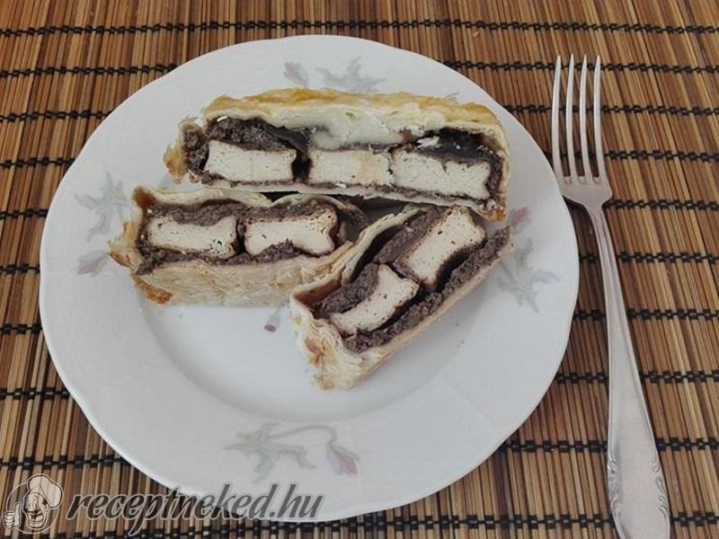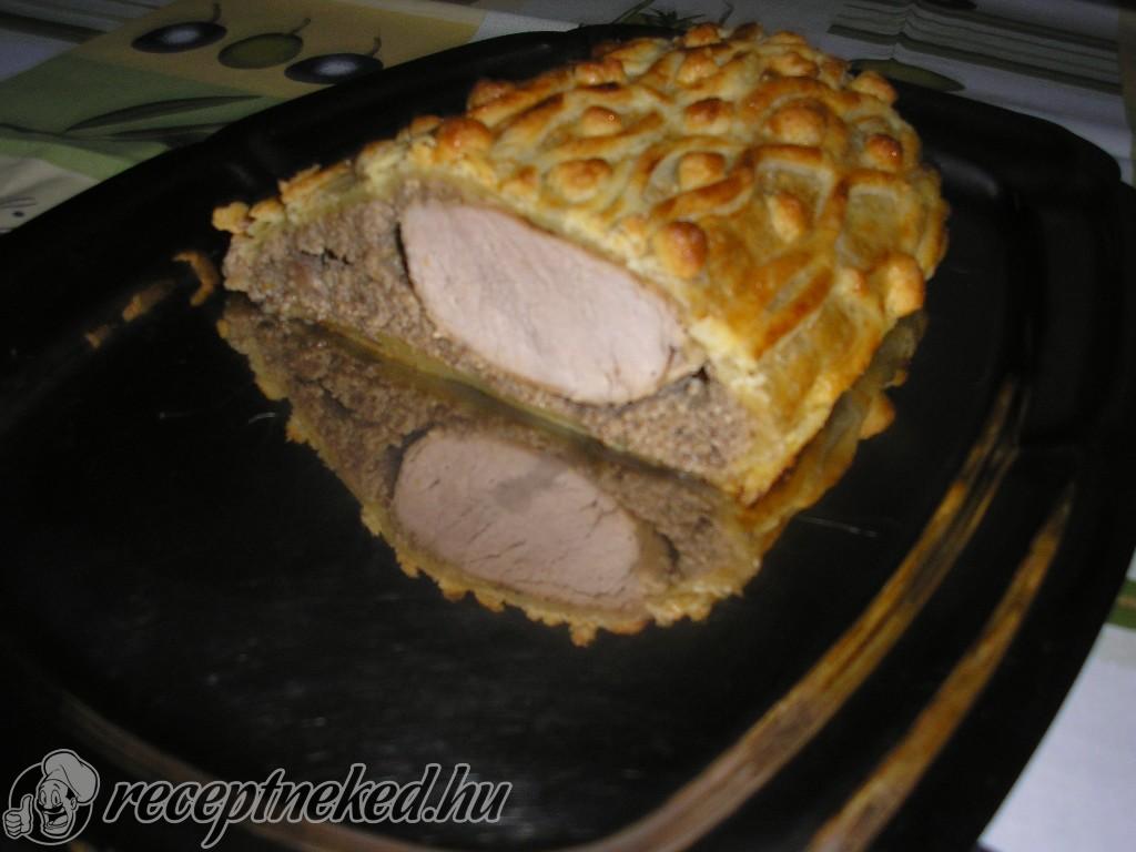 Amíg a hús a hűtőben van, addig előkészítjük a tésztát. Ha nem előre nyújtottat használunk, akkor nyújtsuk ki kb 25*40 cm-es lappá. Elővesszük a húst, kicsomagoljuk és a tészta hosszabbik oldalára rátesszük, majd feltekerjük szorosan, a végeit lezárjuk. Újabb fél órára hűtőbe tesszük, hogy visszadermedjen a tészta is.