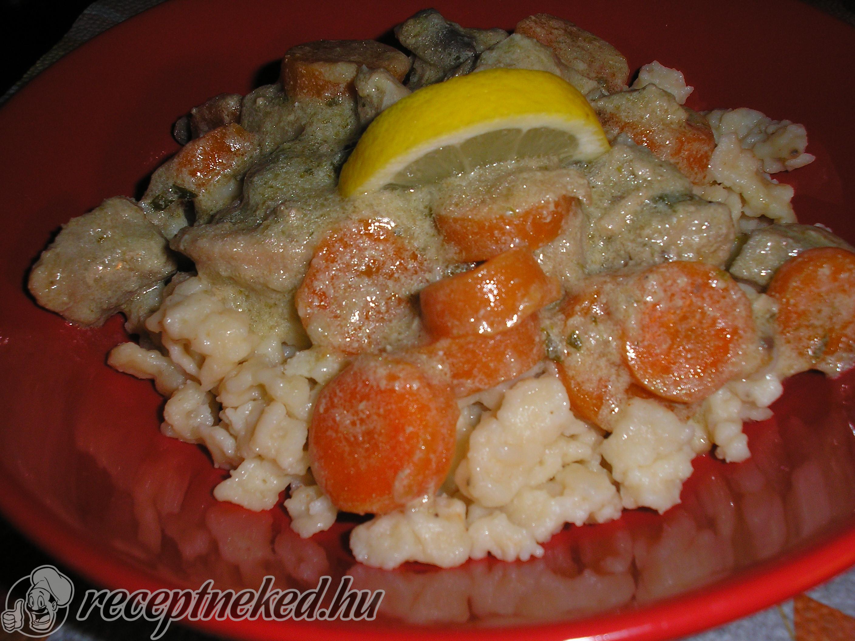 Mikor a hús puha, beletesszük a felkarikázott sárgarépát és darabolt gombát, ezeket is puhára főzzük. Megsózzuk, borsozzuk a ragut és pár csepp citromlével ízesítjük. A maradék tárkonyt beledobjuk, tejföllel beforraljuk. Levesszük a tűzhelyről és nokedlivel tálaljuk.