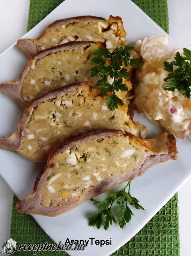 [box style=”info”]Elkészült életem első töltött dagadója. Kicsit félve, de nagy izgalommal és kíváncsisággal vágtam bele. Nem volt nagy a hús, ezért kevéske tölteléket állítottam össze, amibe most darált hús nem került. Mivel egyben vásároltuk a dagadót, Páromnak jutott a nemes feladat, hogy felszúrja 🙂