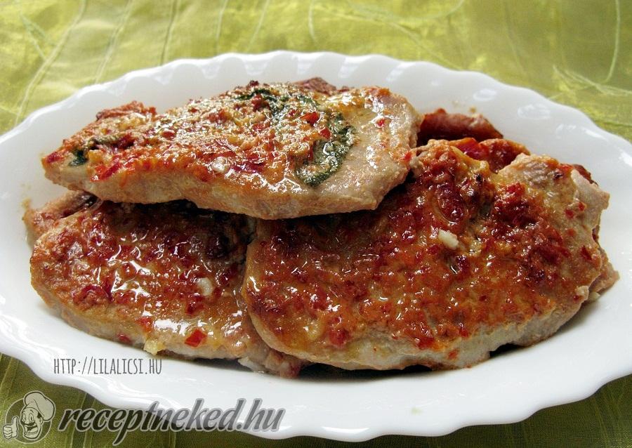 A húst mossuk meg, itassuk le a felesleges vizet és szeleteljük fel vékonyan. Sózzuk és szórjuk meg borssal, majd a hússzeletek mindkét oldalát kenjük be az elkészített szósszal és tegyük hűtőbe legalább egy órára.