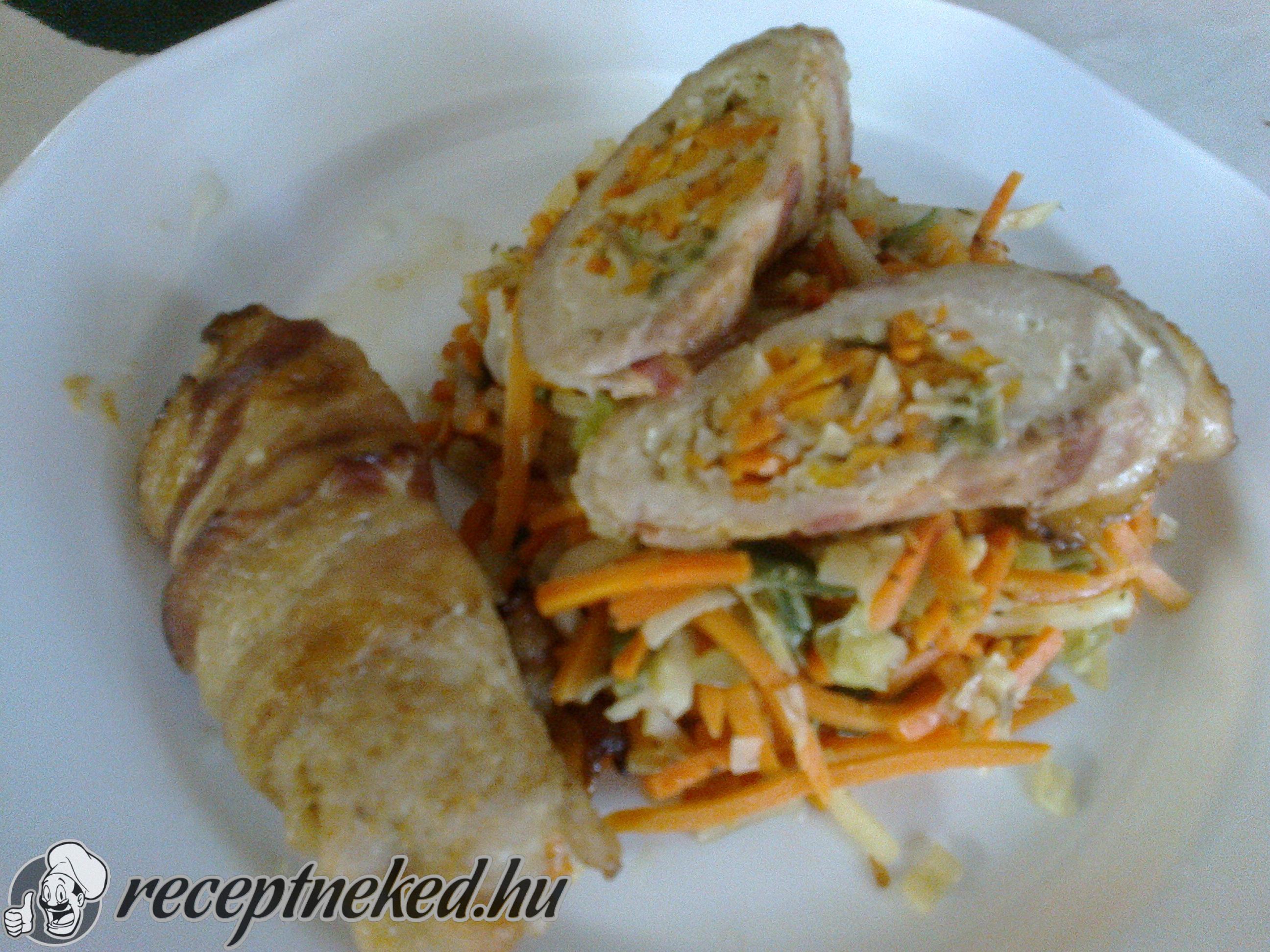A szeletek közepére helyezünk 1 kanálnyi zöldséget és szorosan feltekerjük majd begöngyöljük a baconszalonnával.