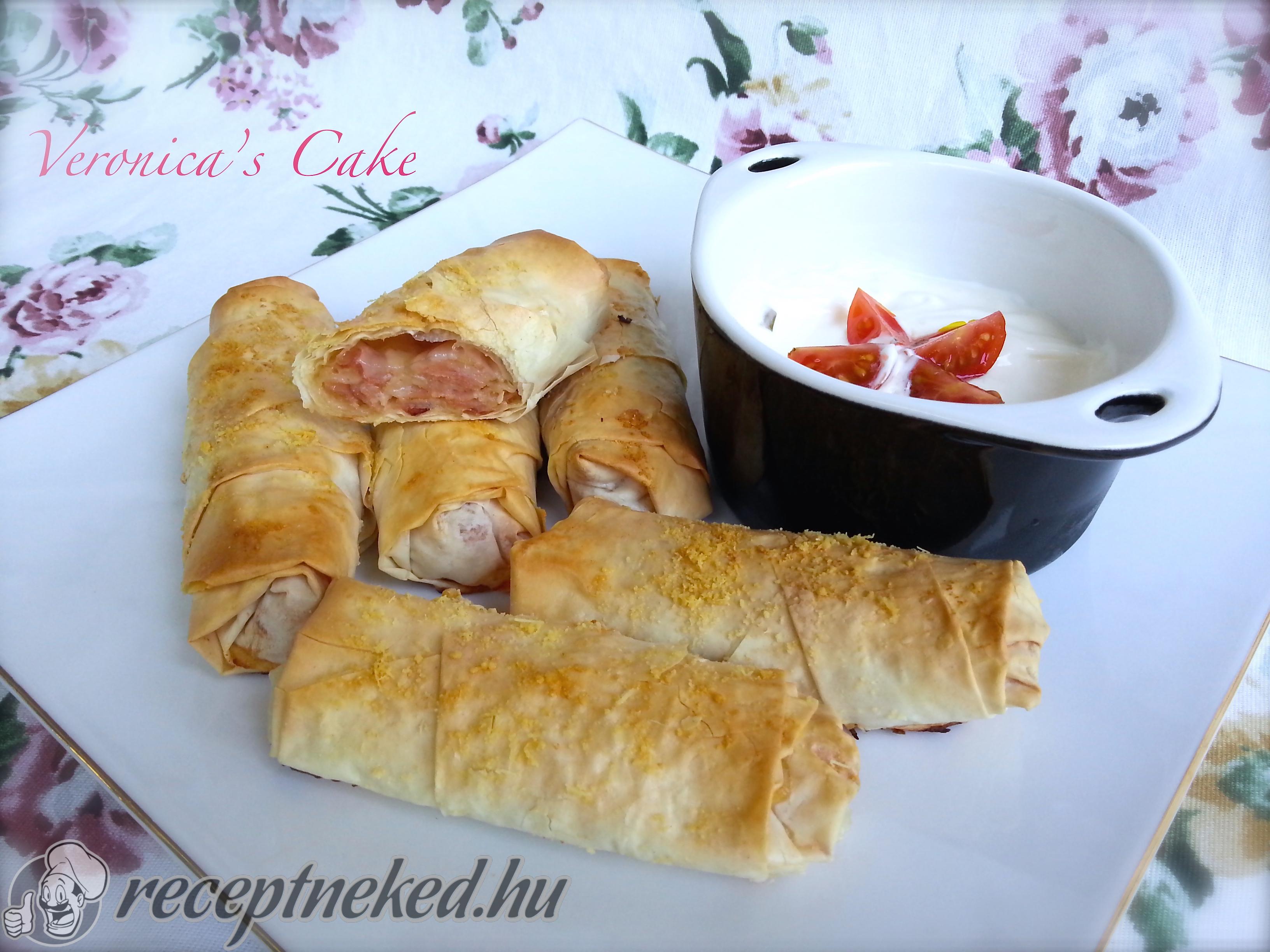 A bacont serpenyőbe tesszük, és egy kicsit megpirítjuk. A mozzarellát kisebb darabokra aprítjuk. A réteslapokat nagy háromszögekre vágjuk, vagy csak átlósan szétvágjuk. 2 réteg lapot veszünk, és a leghosszabb oldalára teszünk egy kiskanál pirított bacont, mozzarellát és sajtkrémet. A két szélső oldalát ráhajtjuk a töltelékre (így tuti nem folyik ki sütés közben a töltelék), és feltekerjük.