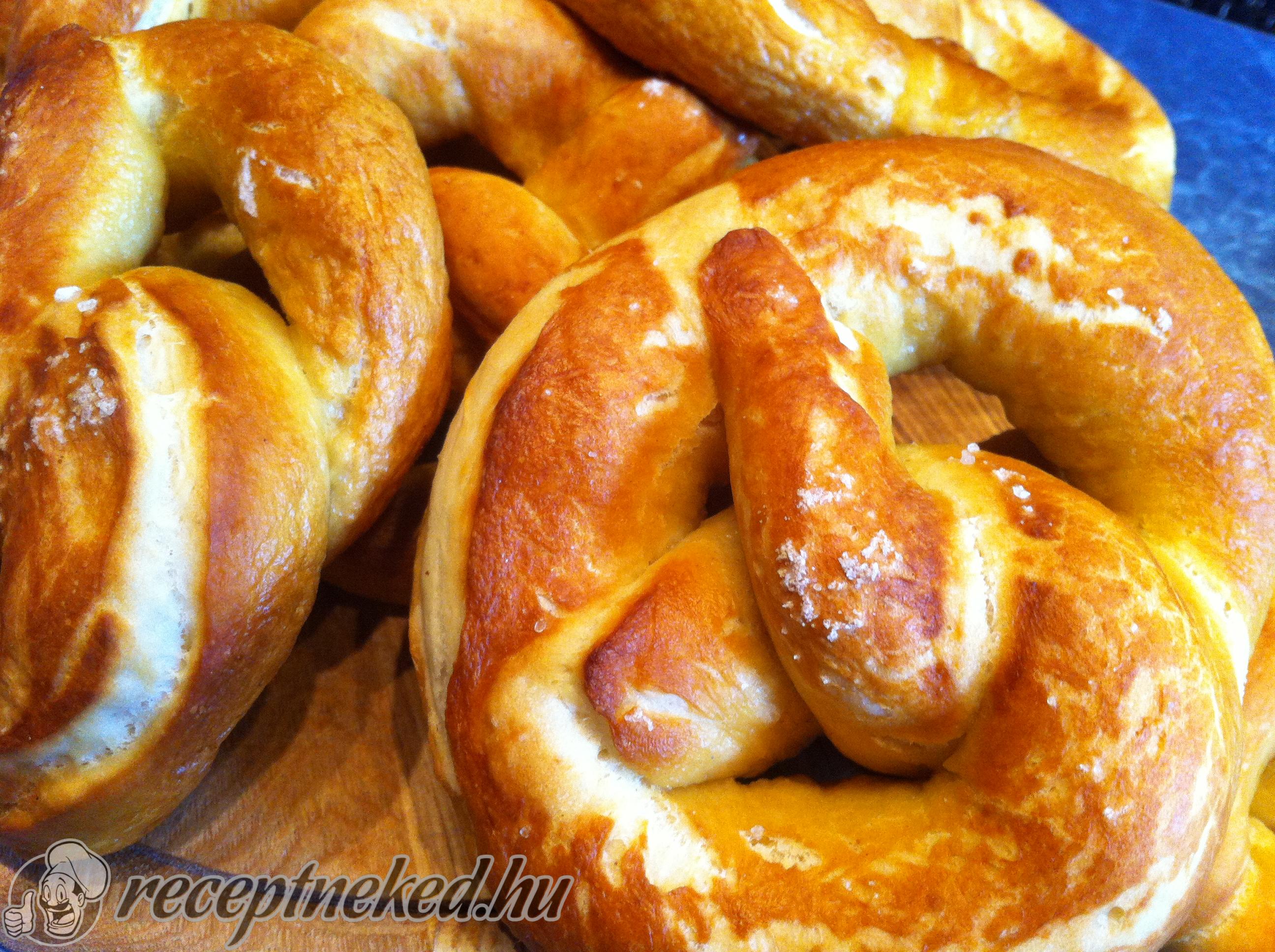 Közben felforralunk 1–1,5 liter vizet 2 teáskanál sóval és egy csomag szódabikarbónával (nagyobb kiszerelést használunk). A megkelt tésztát 8 egyenlő részre osztjuk, és mindegyikből 45–50 cm hosszú hurkát sodrunk, majd perec formára alakítjuk. A tészta ilyenkor kicsit összehúzódik, de ez természetes.