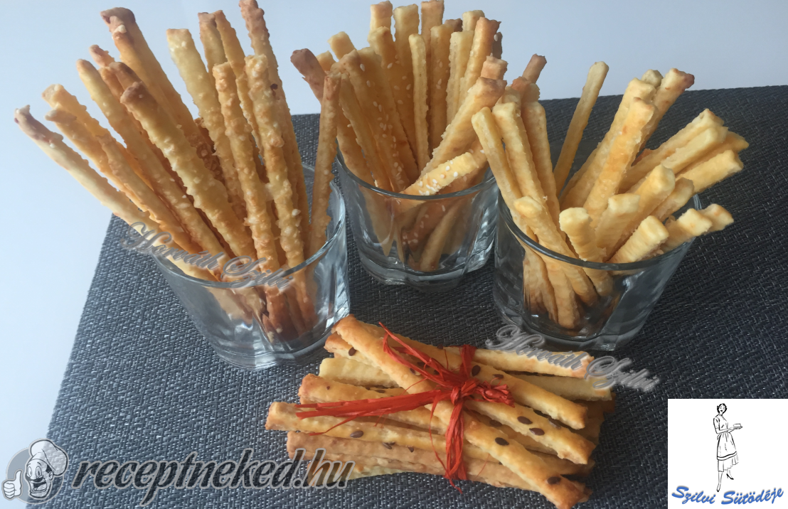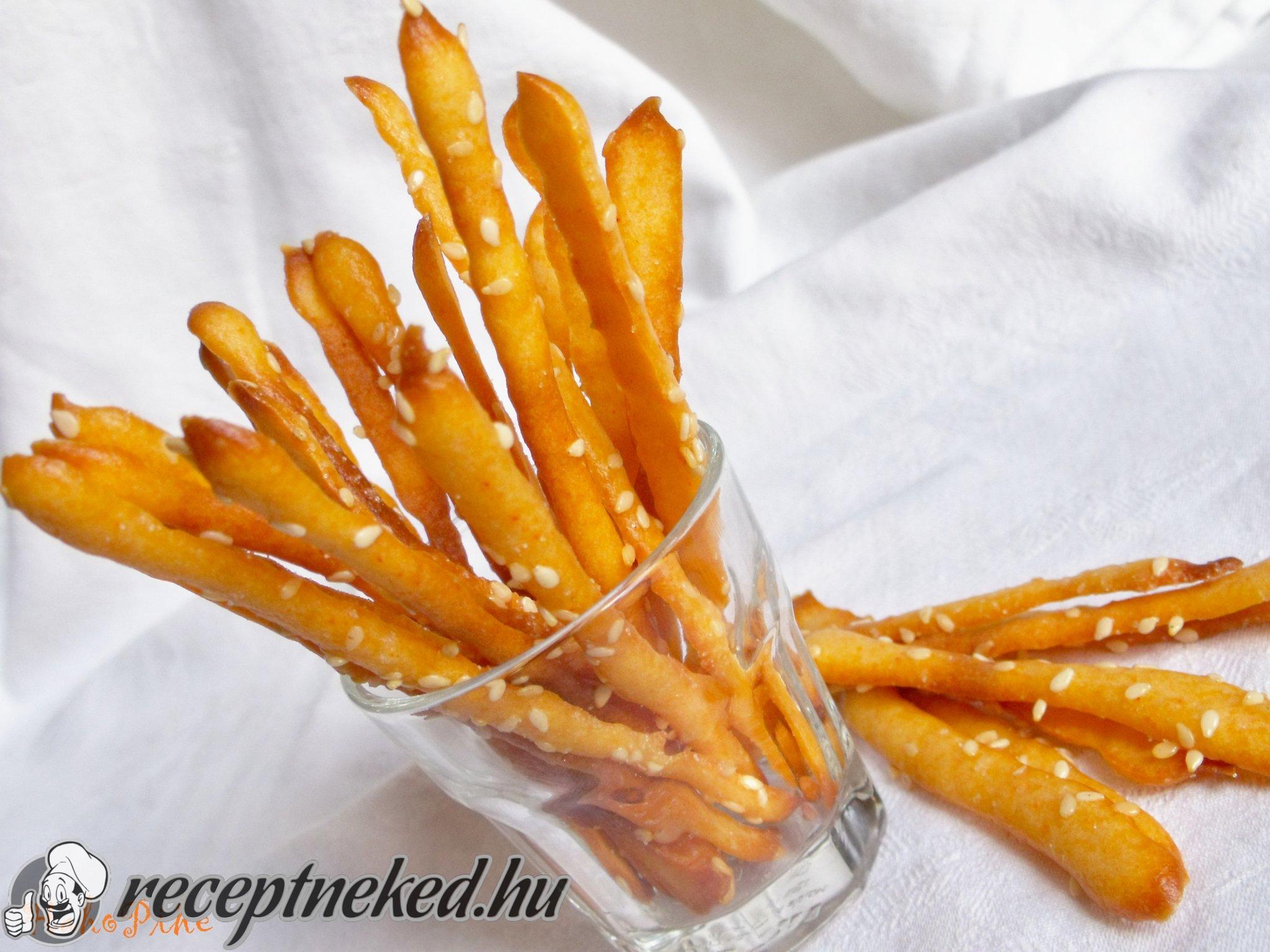 Ezután alaposan lisztezett felületen körülbelül fél cm vastagságú téglalappá nyújtottam, majd húsz centi hosszú, fél centi széles csíkokra vágtam. Megkentem tojással az egészet, sót és szezámmagot is szórtam rá.