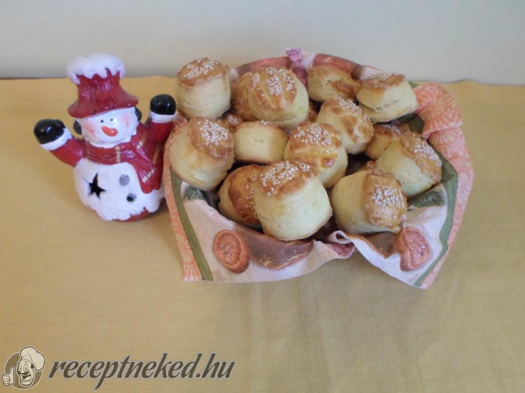 Vékonyan berácsozzuk a tetejét, kis pogácsaszaggatóval kiszaggatjuk, felvert tojással lekenjük és szezámmaggal megszórjuk.