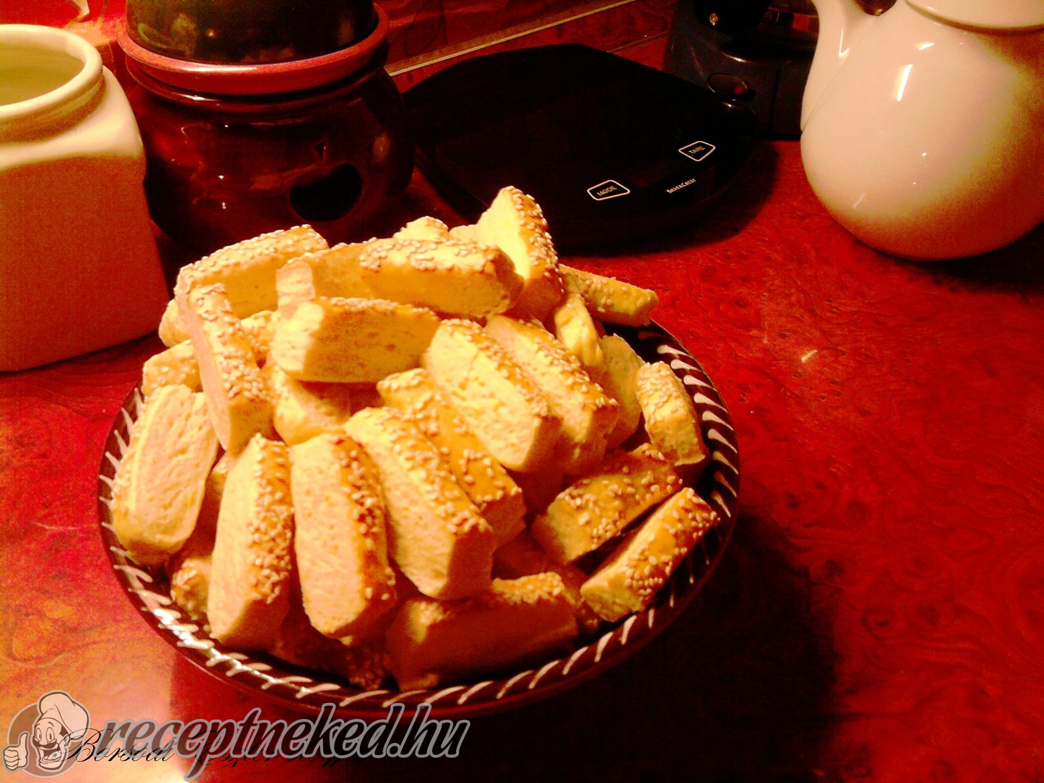 Lisztezett deszkán kinyújtjuk és mutatóujjunkat használjuk mércének: felszeleteljük a kinyújtott tésztát úgy, hogy ujjnyi vastag, ujjnyi magas és ujjnyi hosszú csíkokat kapjunk. Sütőpapírral bélelt tepsire helyezzük úgy, hogy egy ujjnyi helyet hagyjunk közöttük. Ezután kettőt hármat nyomunk az oldalain, hogy hullámos formájúak legyenek a rudacskáink.