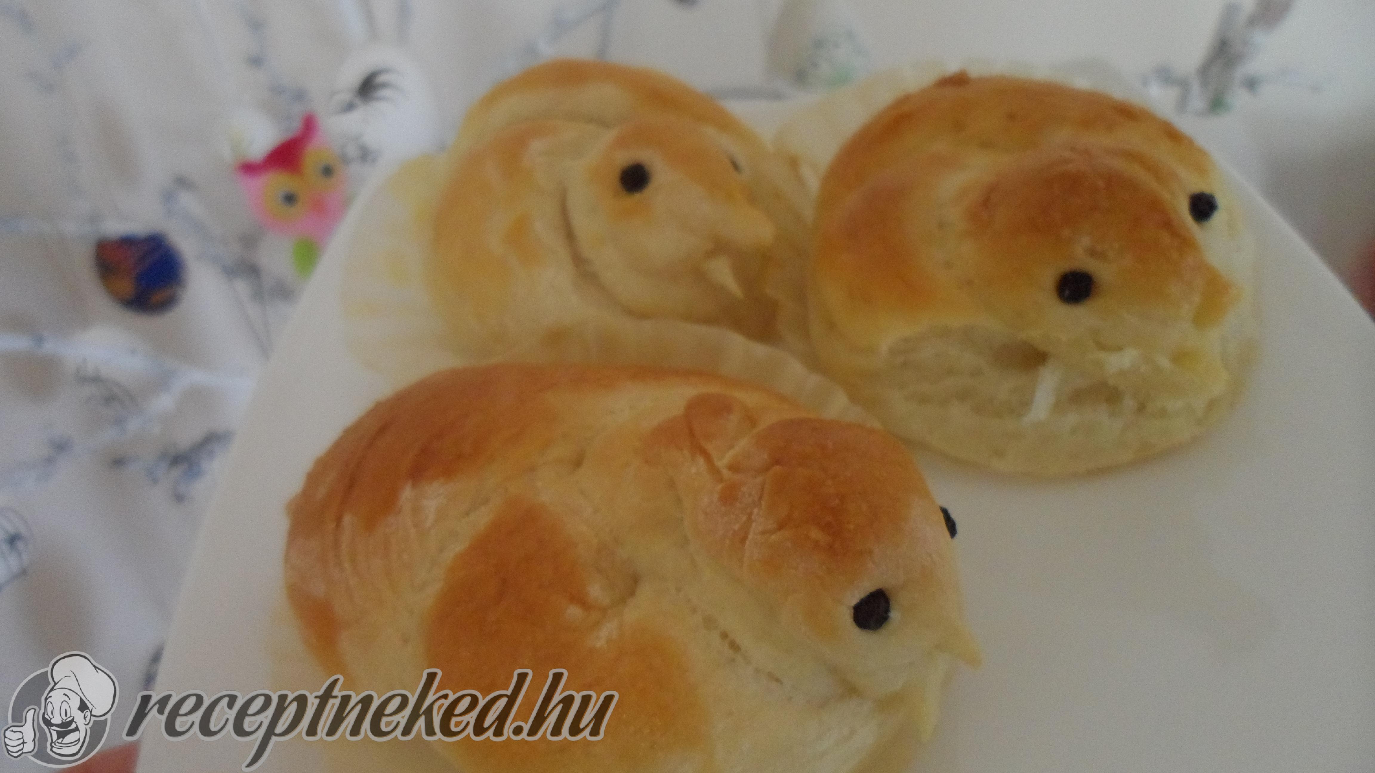 Enyhén lisztezett munkalapon a megkelt tésztát kinyújtjuk kb. 1 cm vastagra és csíkokat vágunk belőle, melyeket kézzel kissé megsodrunk. Egy szál sodort tésztát a kezünkbe véve (mint amikor görcsöt kötünk) egymáson áthúzzuk a tészta két végét. Ez lesz a csibe teste.