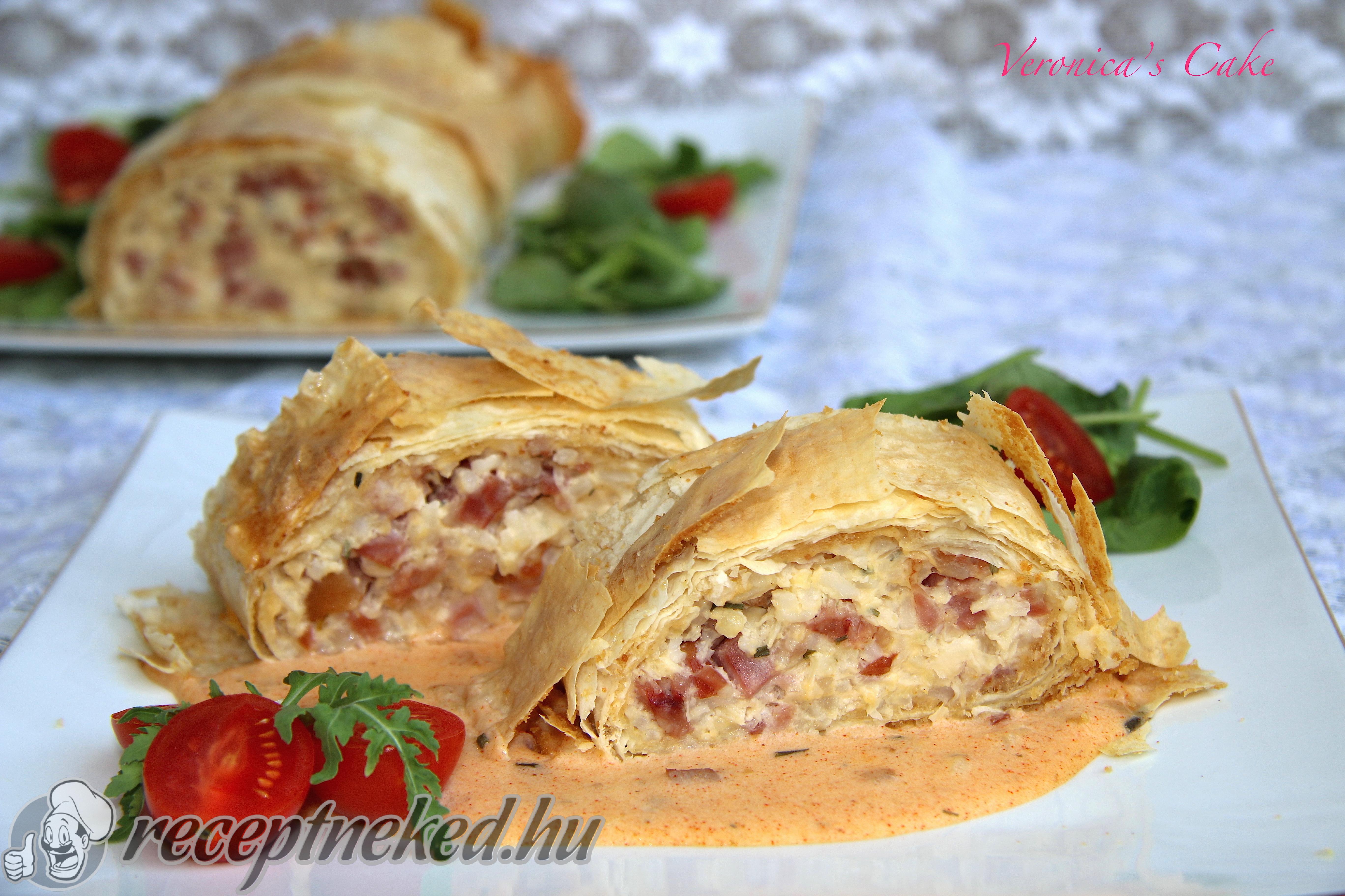 A réteslapokat egyenként megkenjük olvasztott vajjal, és megszórjuk zsemlemorzsával. A húsos tölteléket a felénk eső oldalára halmozzuk, majd a tésztát feltekerjük. Sütőpapírral bélelt tepsibe tesszük, olvasztott vajjal megkenjük a tetejét, és előmelegített sütőben 200 fokon 20-25 percig sütjük.
