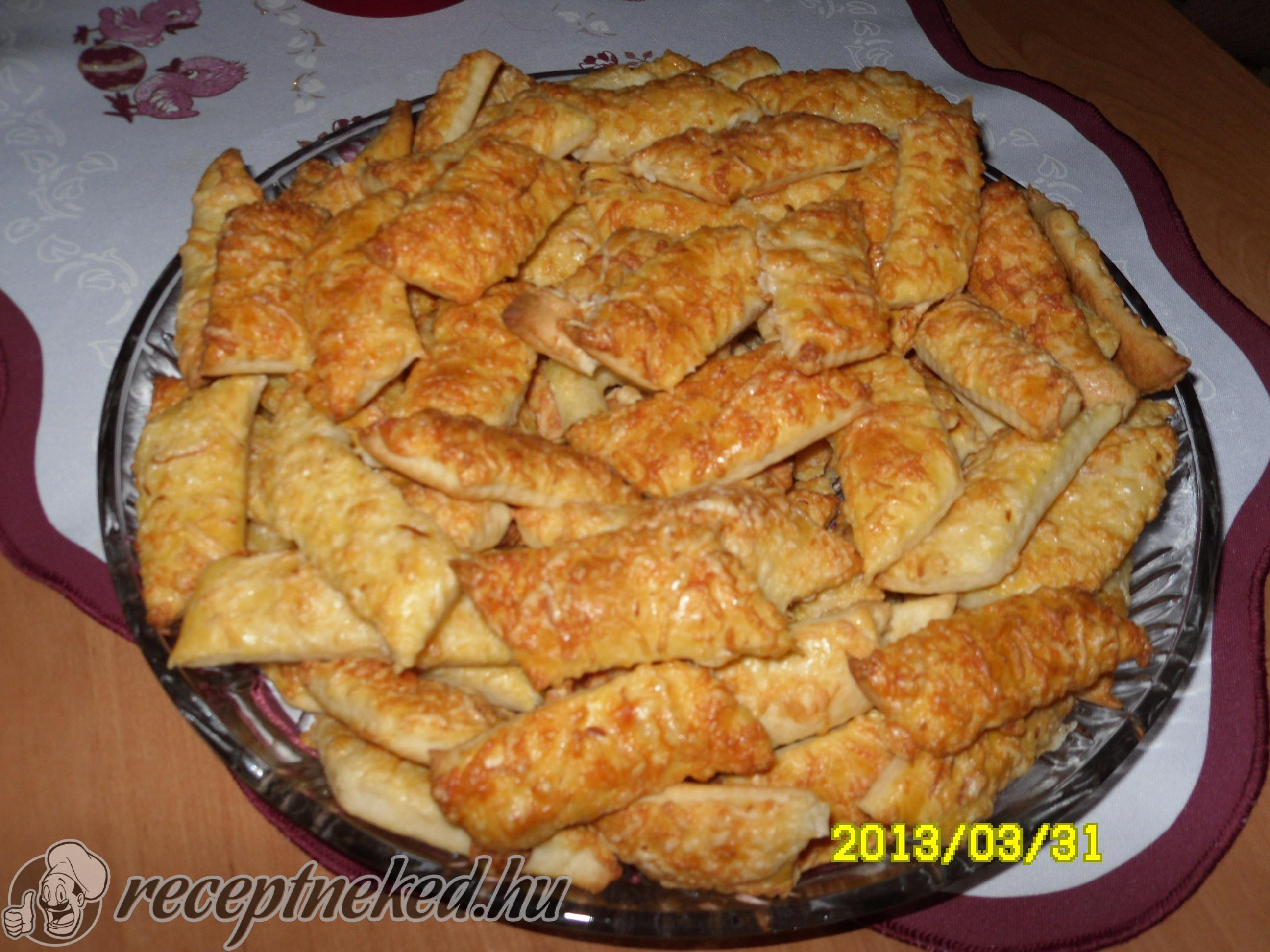 Másnap a tésztát 2-3 részre vágjuk. Kissé lisztezett felületen maximum 5 mm vastagra nyújtjuk a részeket egyenként és derelyvágóval vagy sajtos rúd kiszúróval felvágjuk a tésztát.