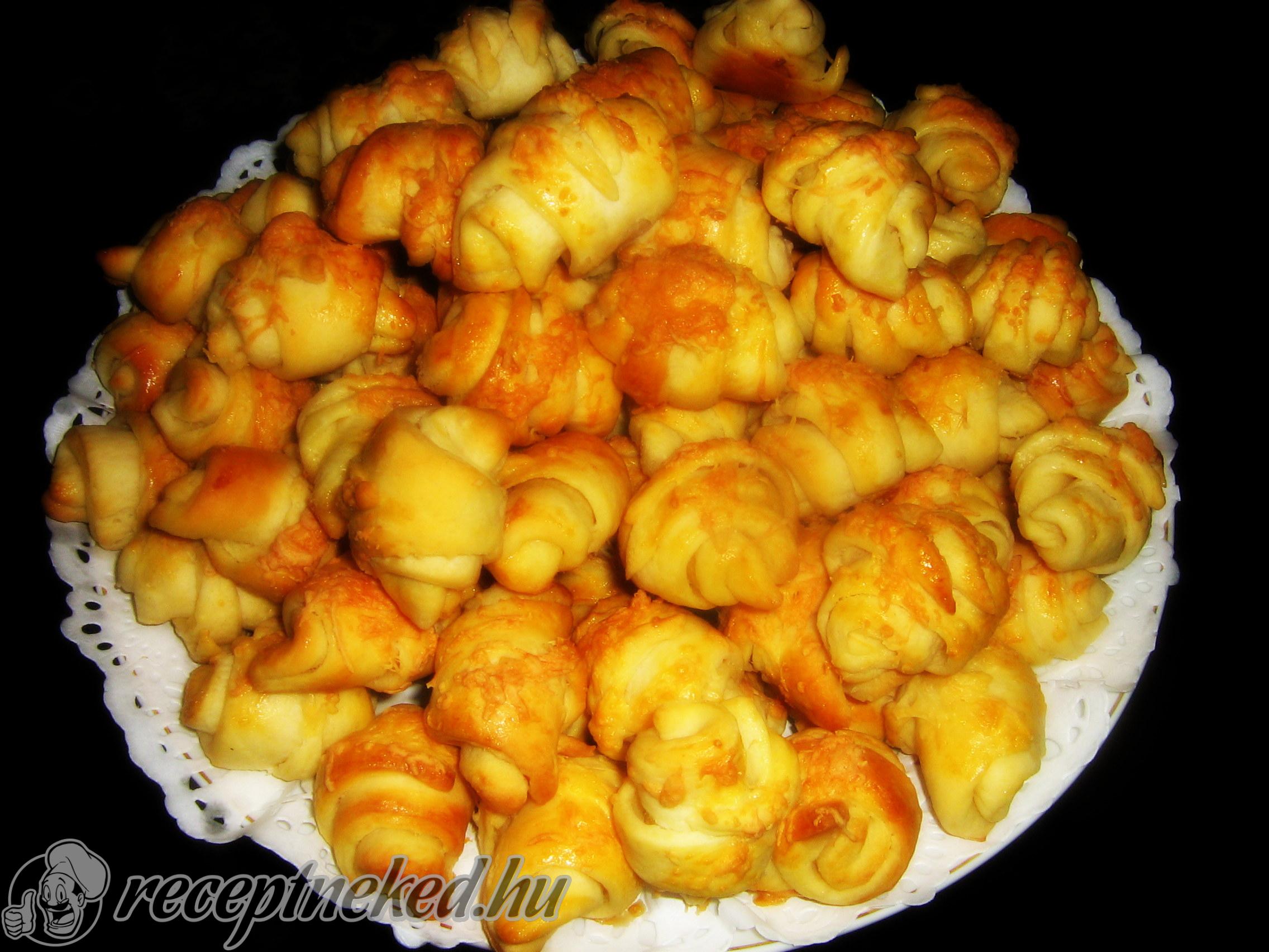 Ezután lisztezett felületre borítjuk és fél cm vékonyra sodorjuk. Éles késsel kb 20 centi hosszú háromszögeket vágunk a tésztából, feltekerjük és tepsire sorakoztatjuk.
