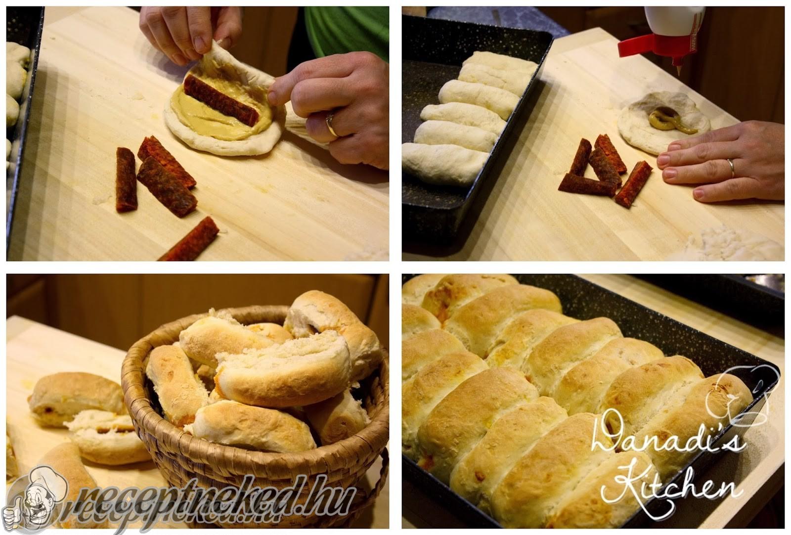 Ha állt egy órát kis darabokat veszünk belőle, majd kézzel kilapogatjuk a képen látható módon. Megkenjük mustárral, majd egy kis darab negyedelt kolbászt teszünk bele. Forró sütőben pirosodásig sütjük.