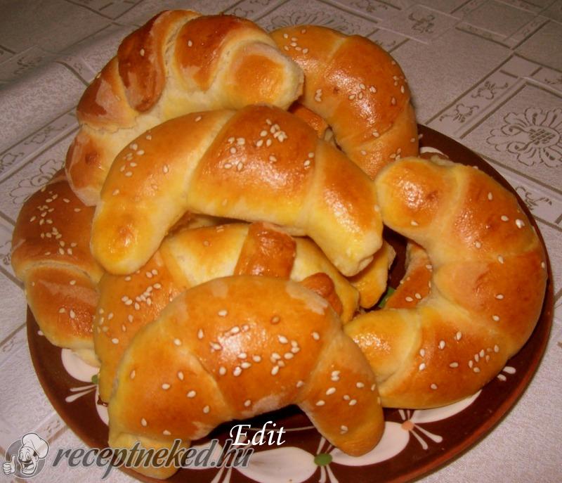 A kifliket lekenjük a tojással és ízlés szerinti magokkal megszórhatjuk, de ez el is maradhat. Bb 20-25 perc alatt aranybarnára sütjük.