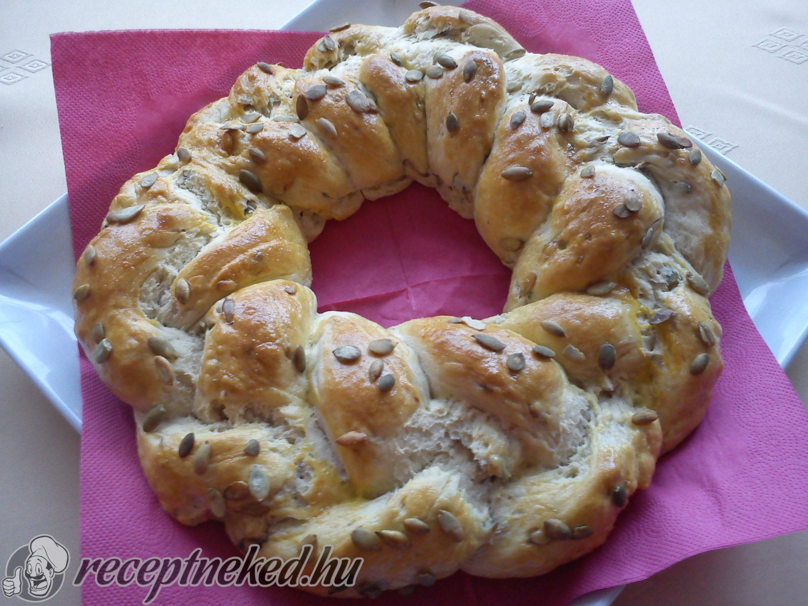 A tésztát letakarva, langyos helyen a duplájára kelesztjük. Lisztezett deszkára tesszük, három részre osztjuk, cipókat formázunk belőlük, majd rudakat sodrunk. A rudakat hármas fonással összefonjuk, és koszorú alakban a tepsibe helyezzük.