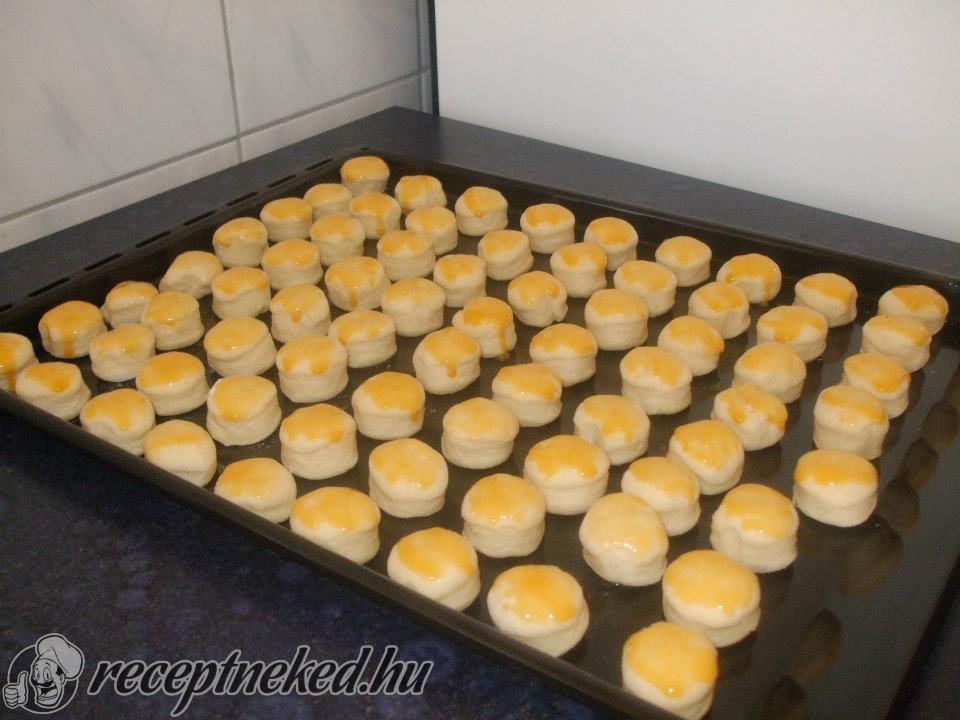 Ezután 1,5 cm vastagra kinyújtjuk, felvert tojással lekenjük,reszelt sajttal megszórjuk és pogácsa szaggatóval kiszúrjuk.