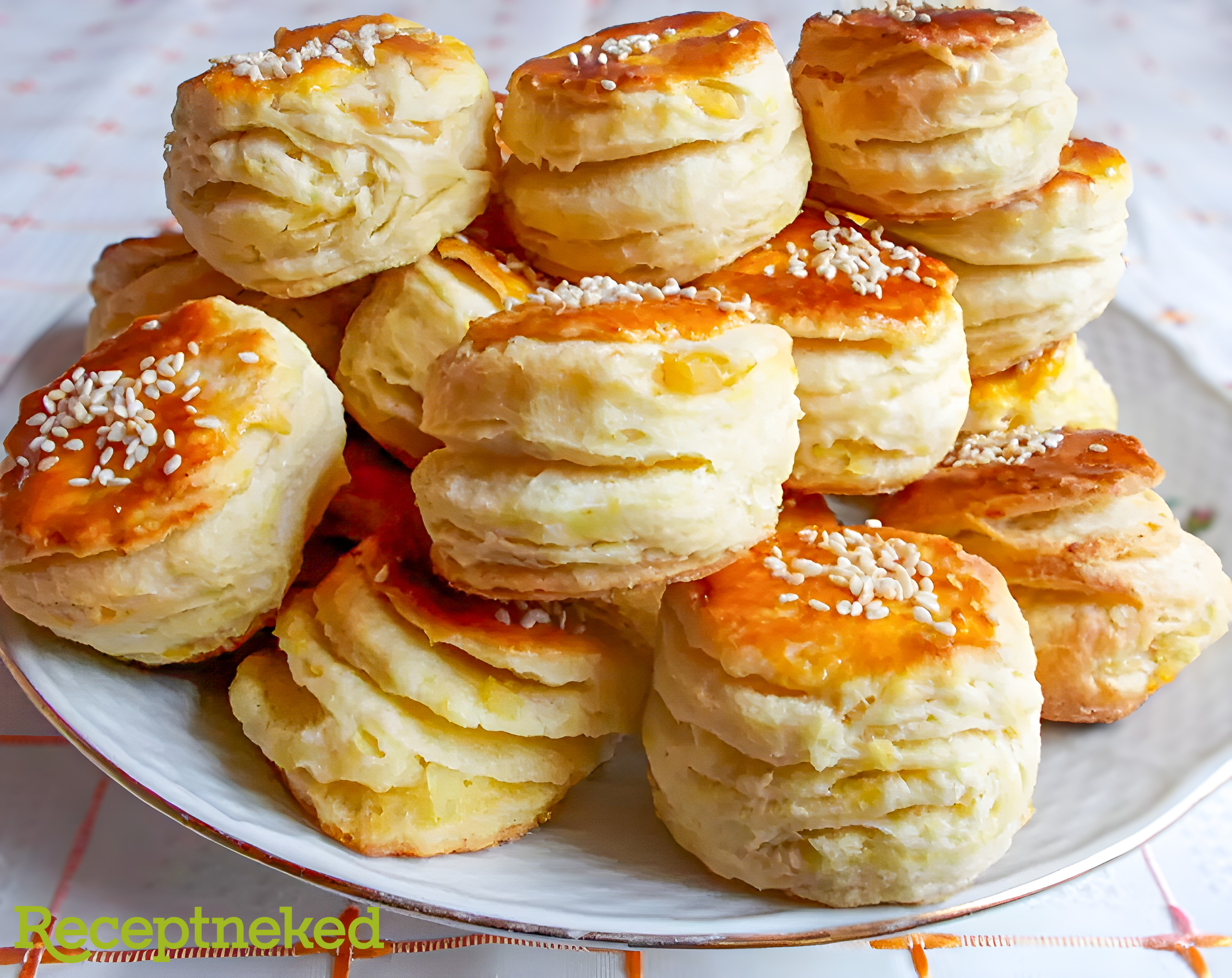A megkelt tésztát kb 2,5 cm vastagra nyújtjuk, tojássárgával lekenjük és tetszőleges átmérőjű szaggatóval kiszúrjuk. A pogácsákat szezámmaggal megszórjuk és sütőpapíros tepsire sorakoztatjuk.
