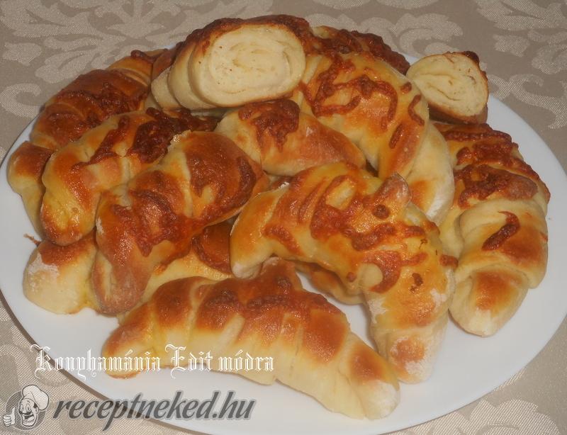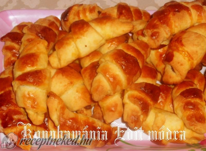 A tésztákat egyenként nyújtsuk ki 25 cm nagyságú körlappá, amiket egyenként vágjunk 8-8 cikkre. Egy-egy teáskanál tölteléket tegyünk a tészták szélesebbik felére és tekerjük fel, majd tegyük sütőpapíros tepsire egymástól kicsit távolabb.