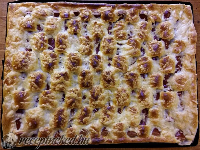 [box style=”info”]A leeső széleket összegyúrtam, kinyújtottam, beletekertem 1-2 megmaradt virslicsíkot, megkentem tojással, és ugyanígy megsütöttem. Nagy sikere volt! :)[/box]