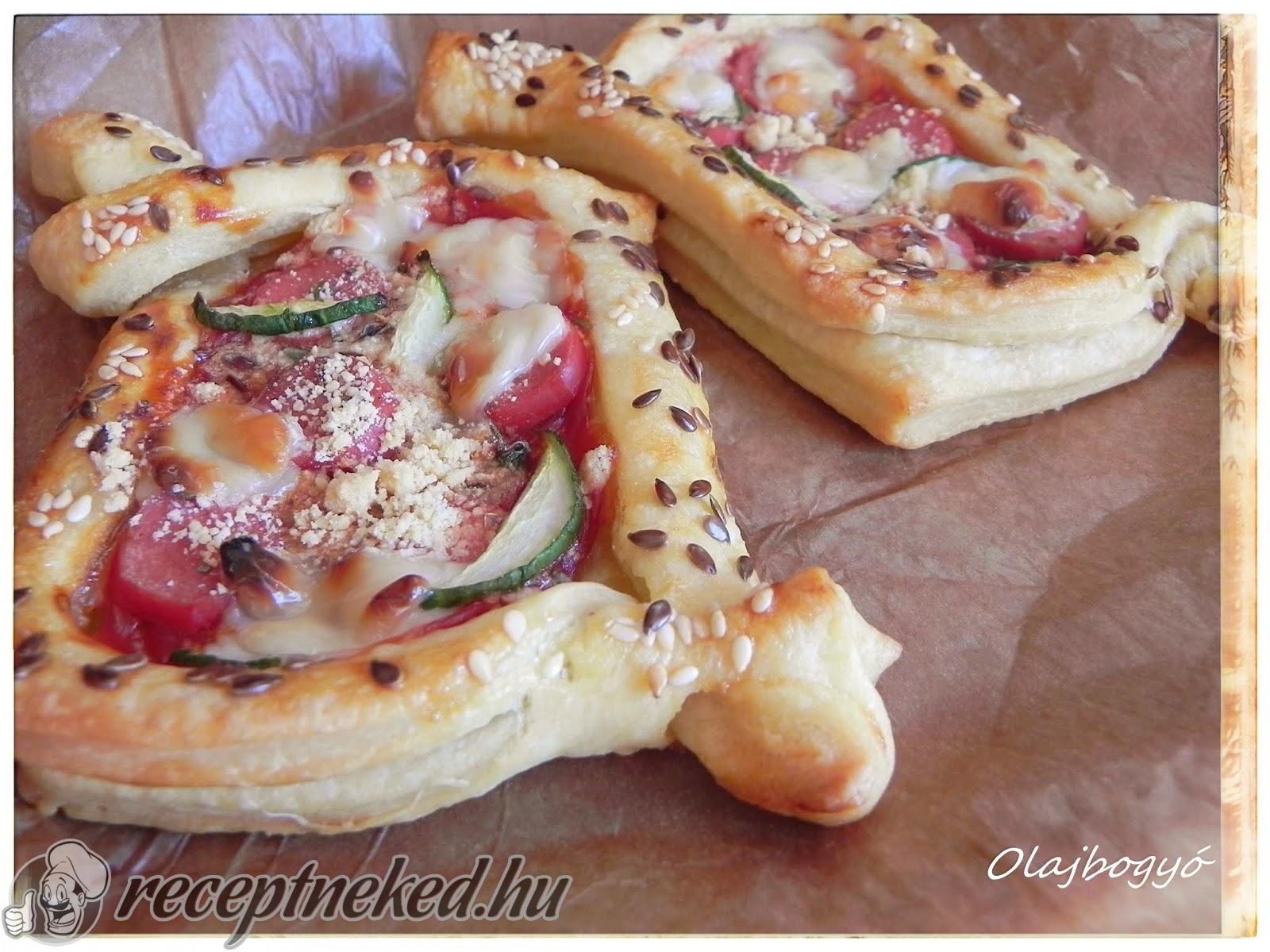 A sütőt előmelegítjük 200 °C-ra, és egy közepes méretű tepsit sütőpapírral kibélelünk. A leveles tésztát vékonyra nyújtjuk, széleit levágjuk, majd egyenlő méretű kockákra vágjuk. Mindegyik tésztakockán körben 2×2 cm-es peremet vágunk éles késsel úgy, hogy az egyik szemközti csücsköt nem metsszük át teljesen. Ezt a részt áthajtjuk a másik oldal belső keretéhez, majd a másik szélét is hasonlóan áthajtjuk, így kialakul a keretes forma.