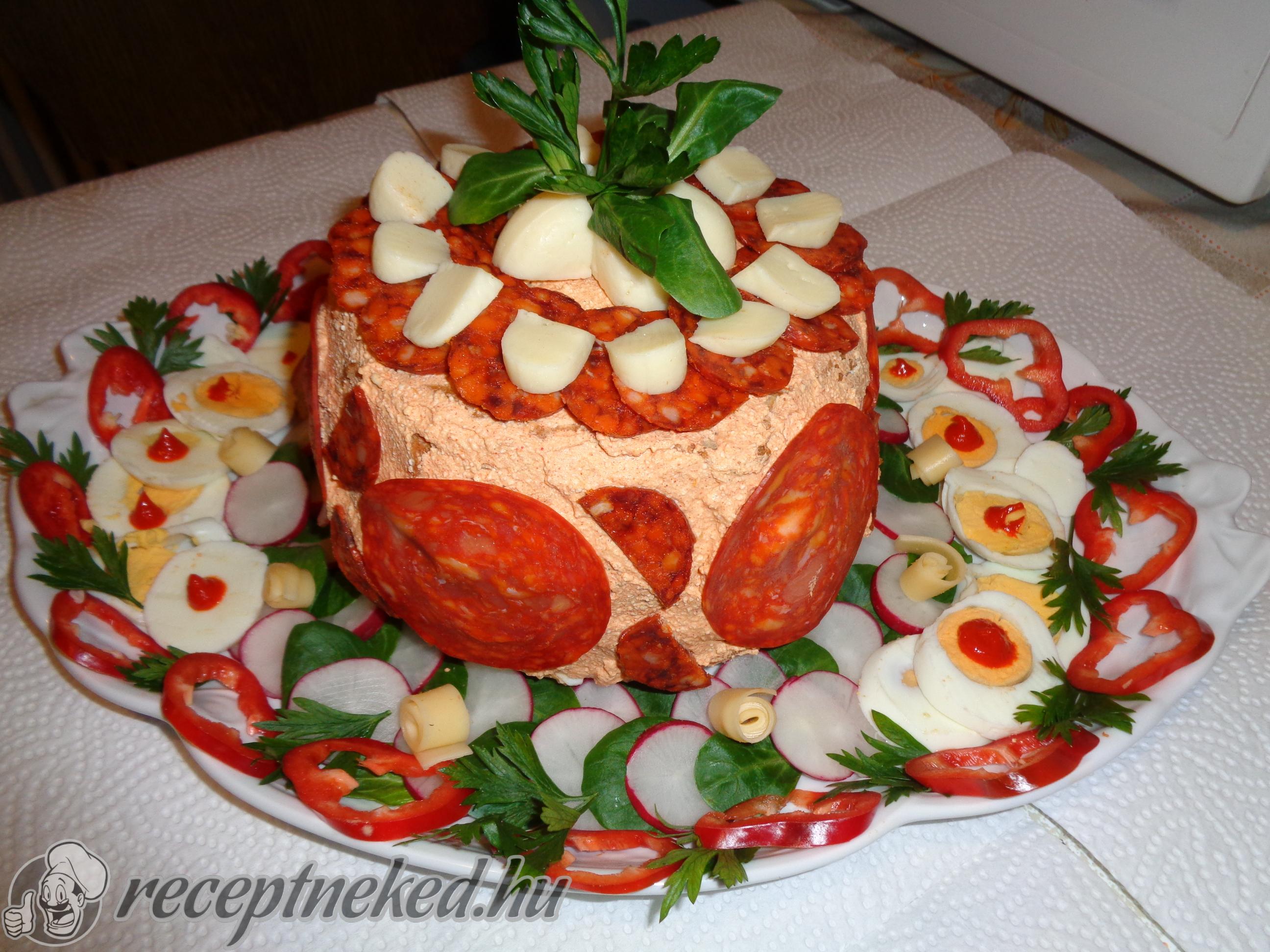 3-4 emelet után a körözöttel szépen besimítjuk a torta tetejét és oldalát, majd díszítésként kolbász és paprikás szalámi szeletekkel, sajt darabokkal díszítjük.