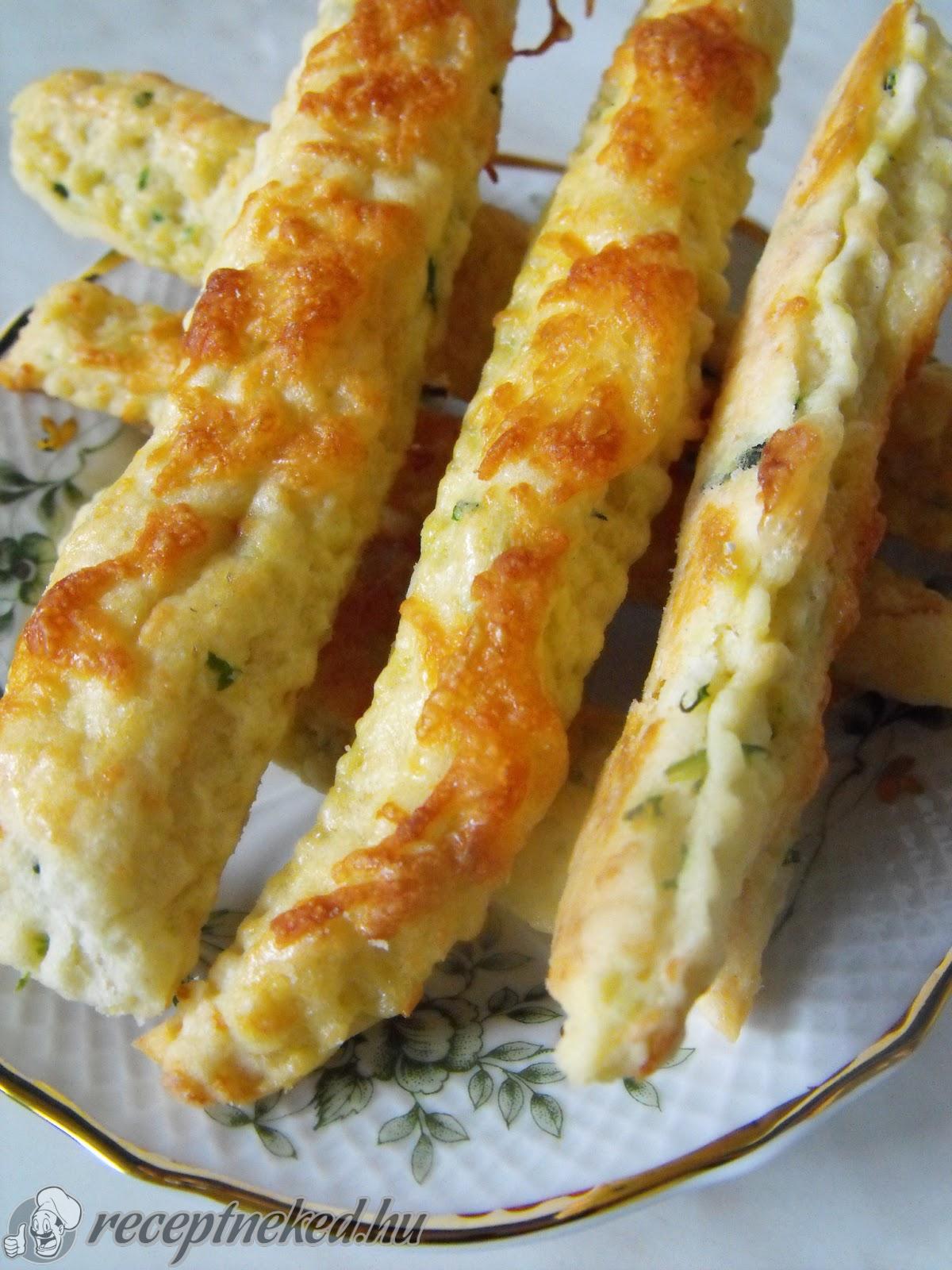 Fél-egy cm-esre kinyújtjuk. Derelyevágóval rudakat vágunk belőle. Tojással megkenjük, tetejére sajtot reszelünk.