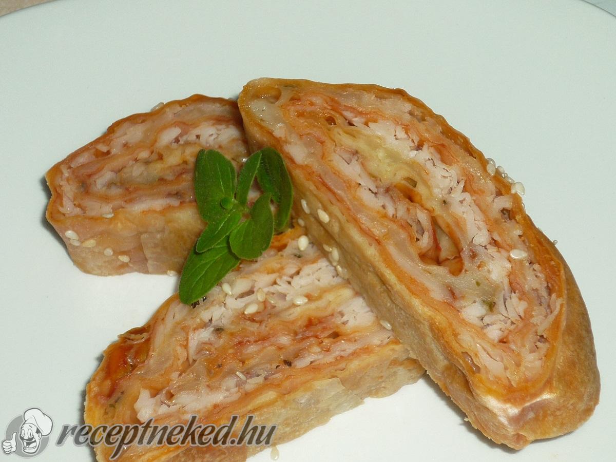 Rátesszük a negyedik réteslapot, tojásos massza, ketchup, végül ráreszeljük a sajt 1/3-át. Óvatosan felcsavarjuk, és vékonyan kiolajozott tepsibe tesszük. Ezt az egész műveletet még egyszer megismételjük, így 2 rúd rétes lesz a végén.