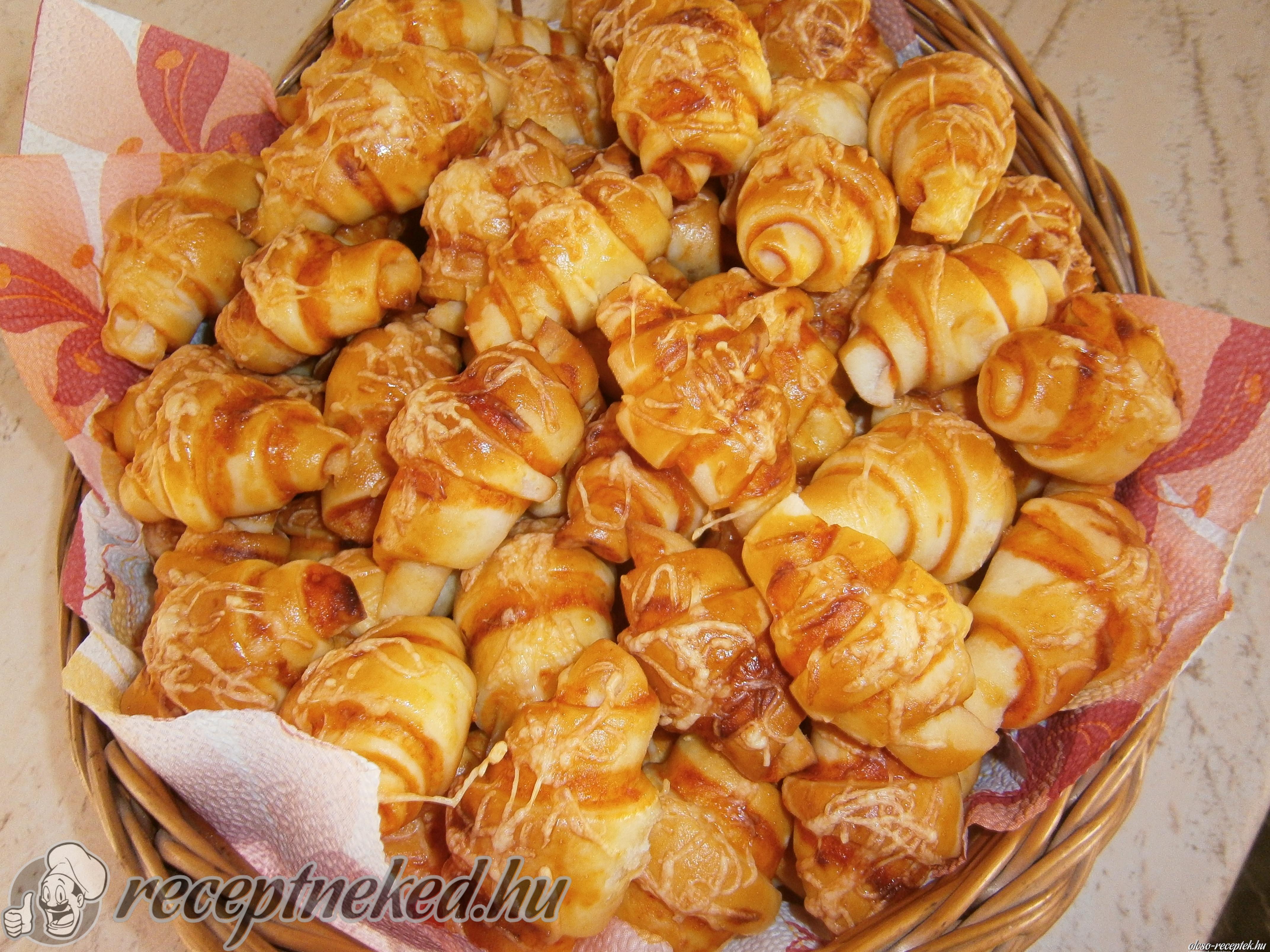 Minden cikk szélesebbik végébe teszünk egy-egy darabka margarint és így tekerjük fel! Sütőpapíros tepsire rakjuk, megkenjük tojással, tetejére sajtot szórunk.