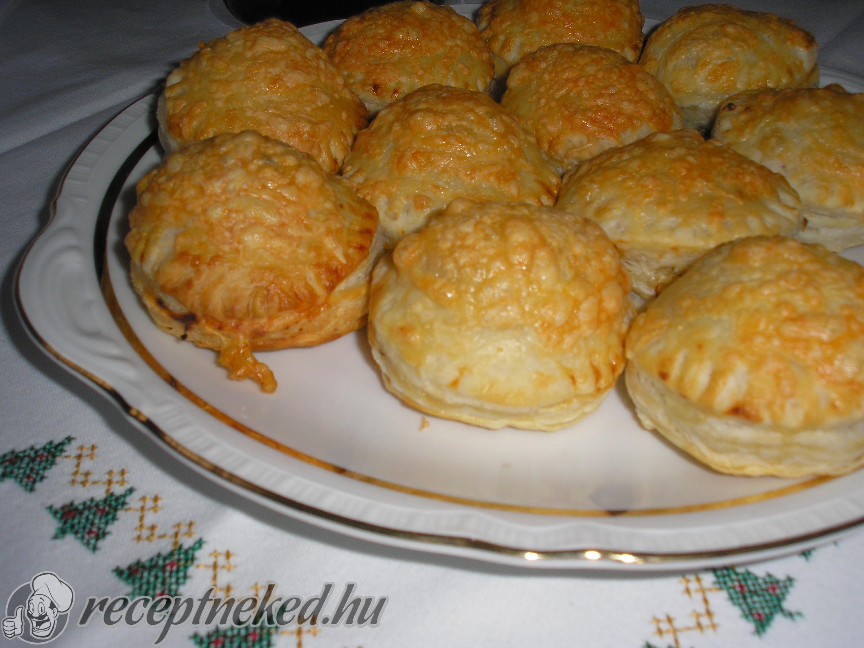 Közben a leveles vajas tésztát hagyjuk kiolvadni, majd akkora lappá nyújtjuk, hogy 24 kört szúrhassunk ki belőle. 12 körre 2-2 púpozott evőkanál tölteléket halmozunk úgy, hogy a szélükön egy keskeny peremet üresen hagyunk.