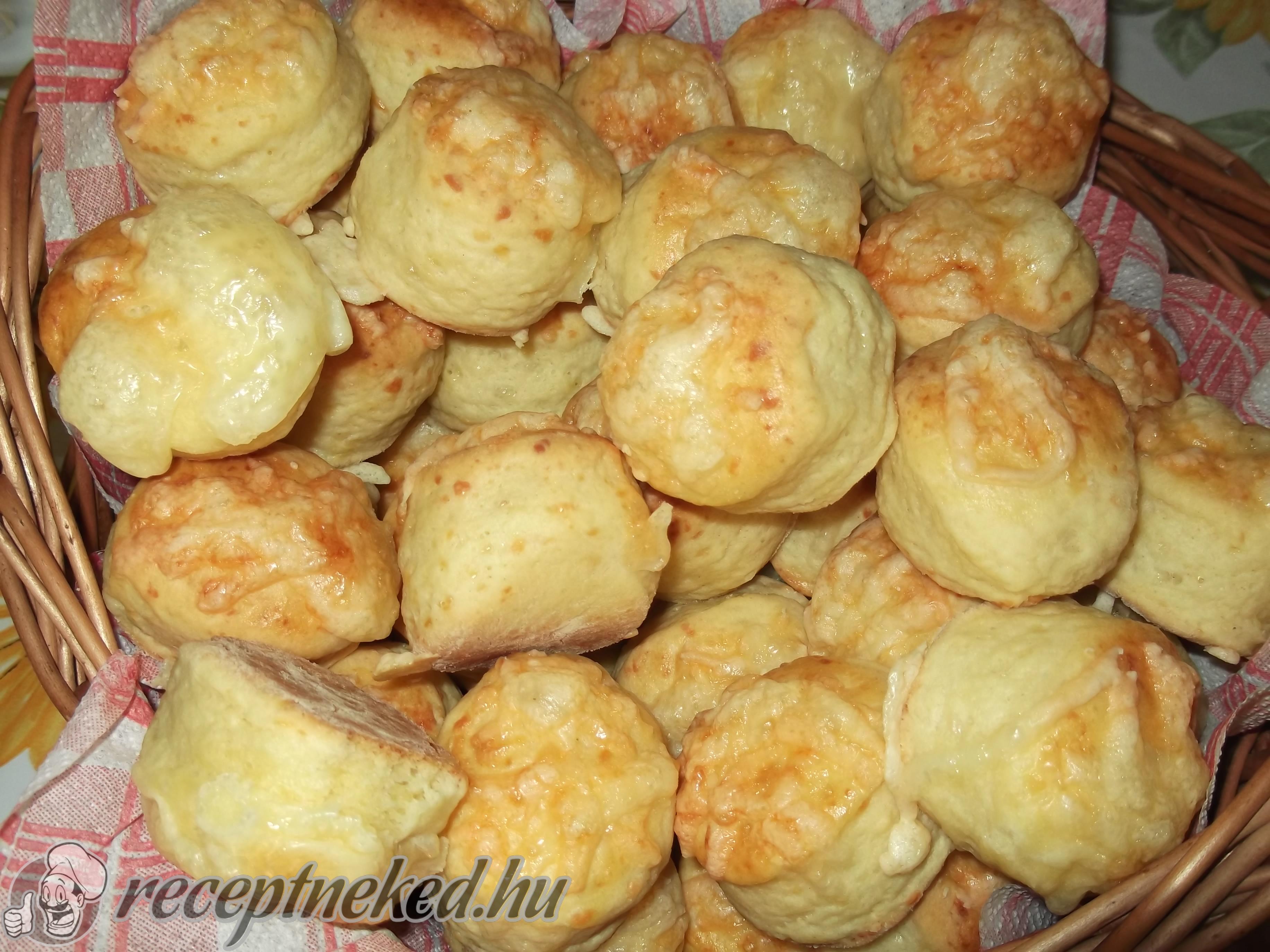 A tetejüket megkenjük a tojásfehérjével, majd megszórjuk a félretett reszelt sajttal. A pogácsákat sütés előtt még 10–15 percig pihentetjük a tepsiben.