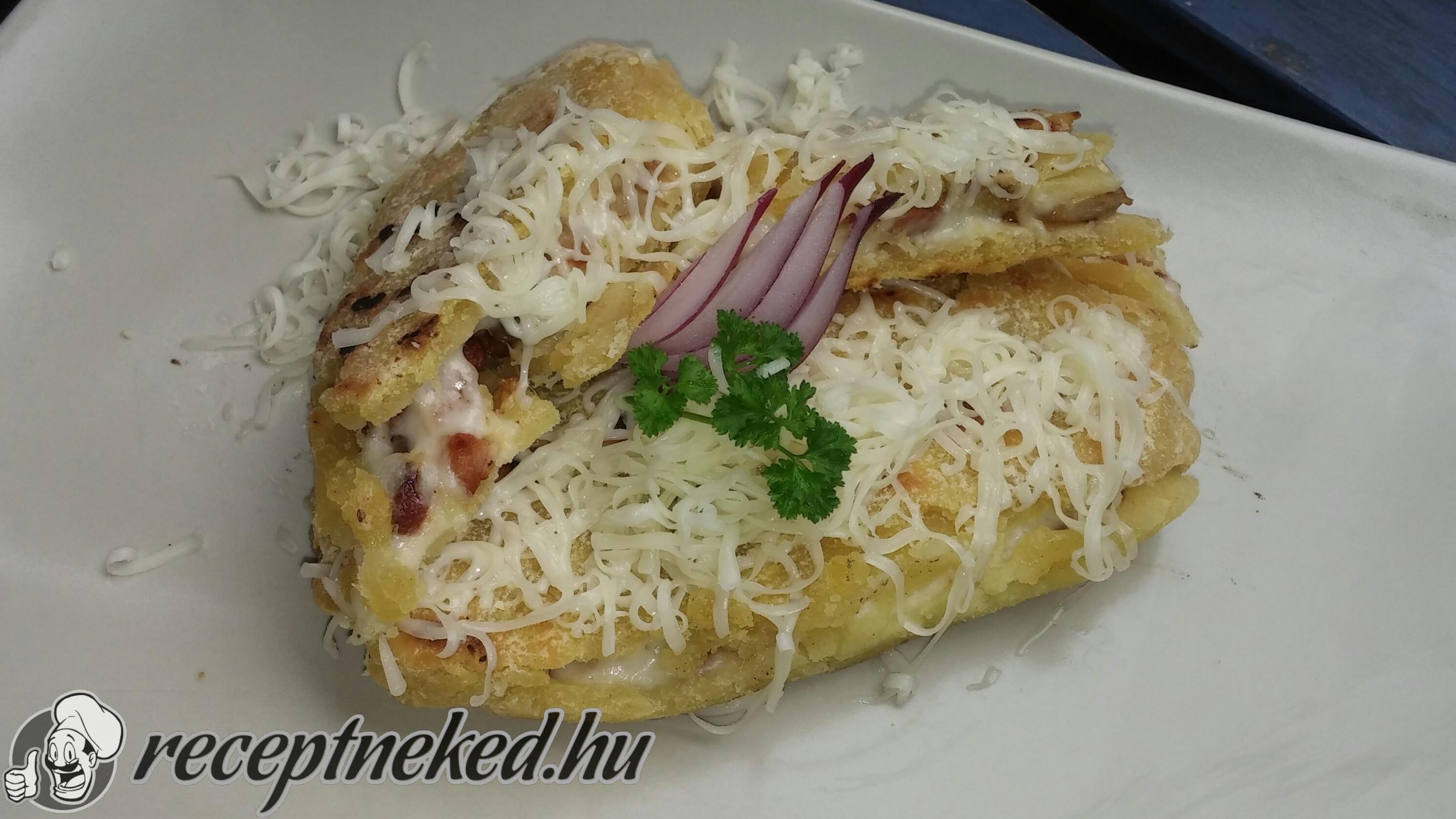 A tésztát lisztezett deszkára teszem, négy egyenlő részre osztom, kb. 1 cm vastagra nyújtom, bele teszem a tölteléket, megszórom reszelt sajttal, széleit össze csíptetem, kicsit kilapítom és egy teflon serpenyőben, olaj nélkül, pár perc alatt, mindkét oldalát megsütöm.