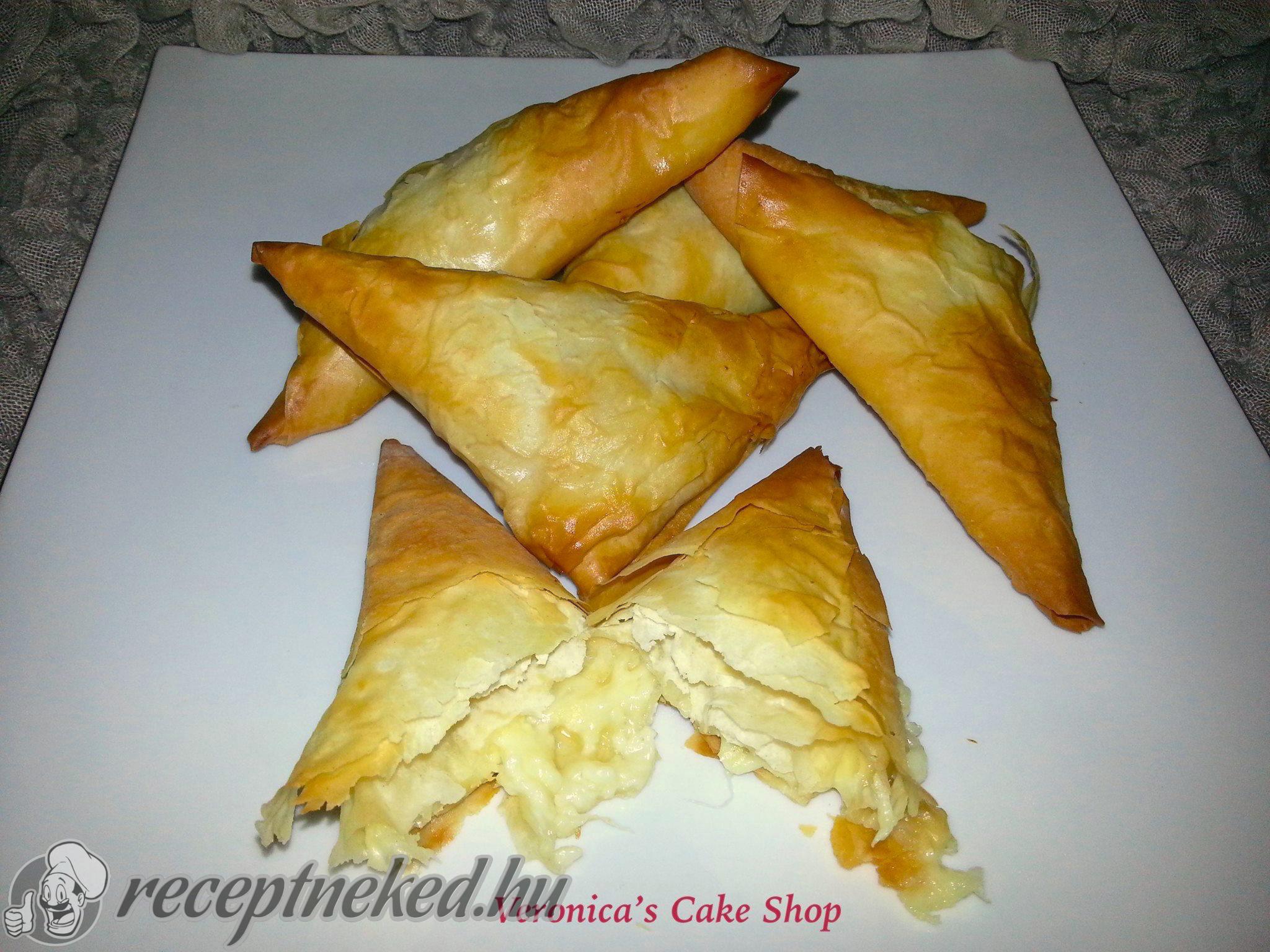 A tésztát 4 részra osztjuk. A cipókat egyenként vékonyra, téglalap alakúra kinyújtjuk. Vékonyan lekenjük az ízesített margarinnal, ekkor megszórhatjuk sajttal is, majd feltekerjük. Kis háromszögekre vágjuk, majd sütőpapíros tepsire sorakoztatjuk.