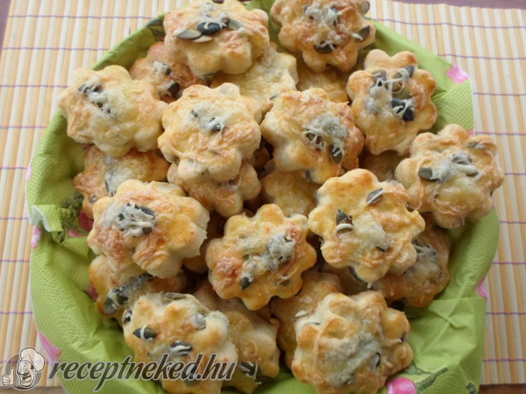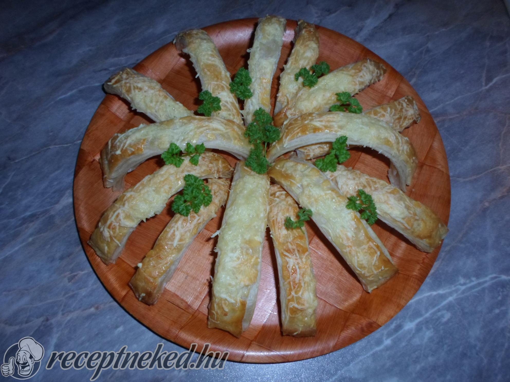 Lisztezett deszkán kinyújtom és tetszés szerint feldarabolom. Sütőpapírral bélelt tepsire helyezem, majd felvert tojással megkenem.
