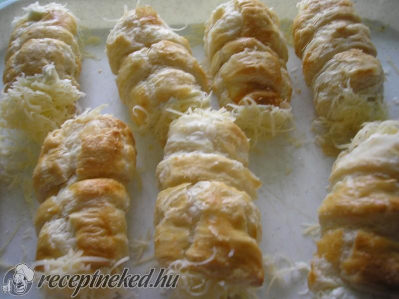 A tésztát csíkokra vágjuk és a beolajozott formákra tekerjük, majd megkenjük tojással. Előmelegített sütőben 180 fokon kb 20 percig.
