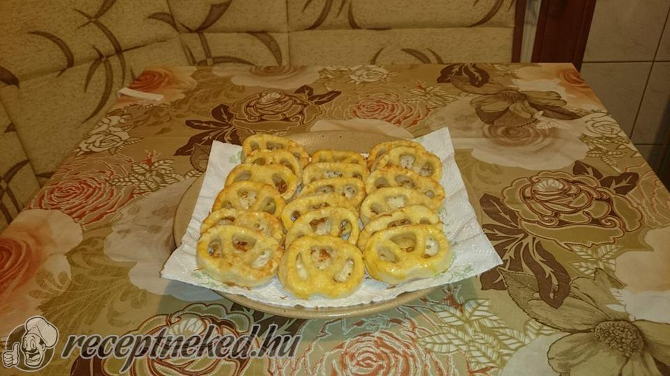 A belsejébe rakjuk a sajtszeleteket és összecsipkedjük, majd ezután perec alakúra formázzuk.