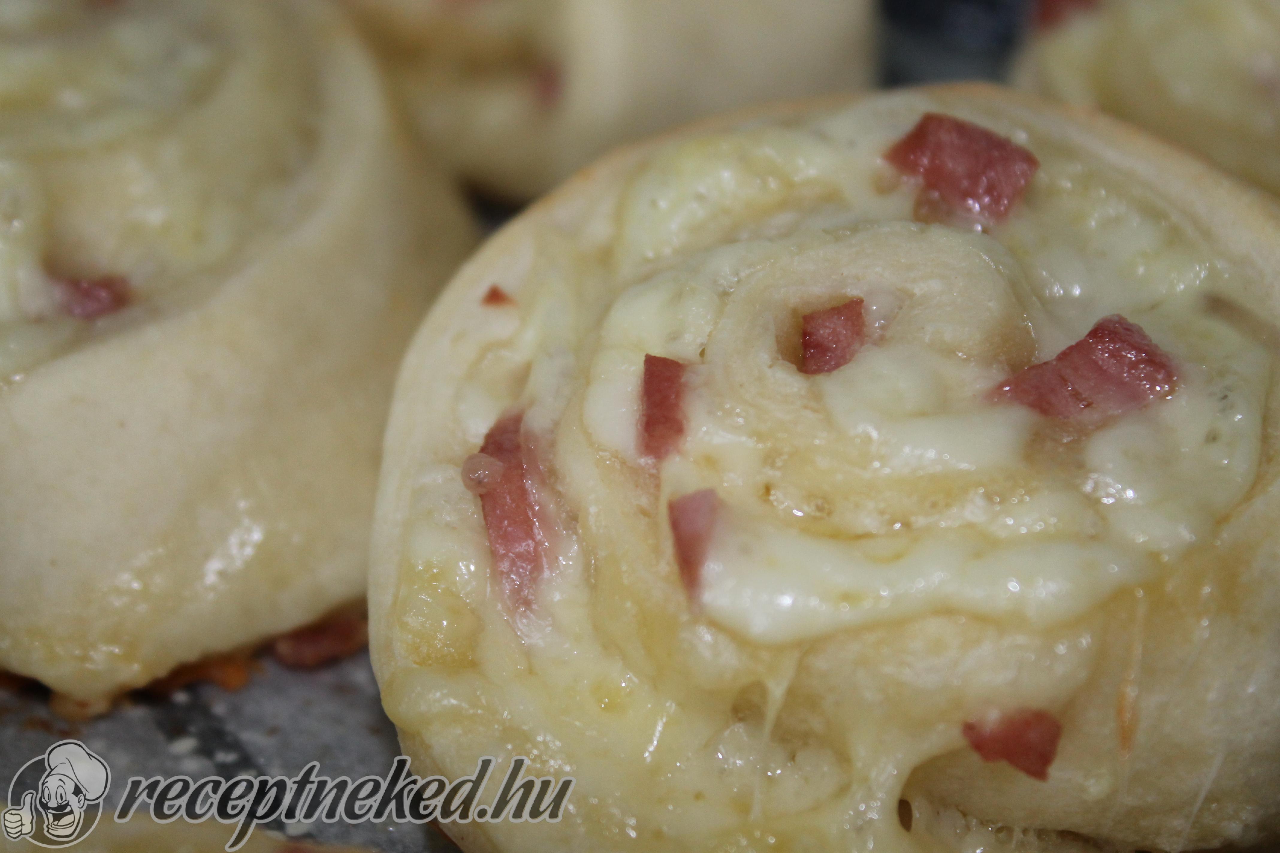 A töltelékhez felolvasztjuk a margarint, beletesszük az összezúzott fokhagymát, ezzel kenjük meg a kisodort tésztát, majd rászórjuk a kockára vágott sonkát és a reszelt sajtot. Felcsavarjuk mint a kalácsot és ujjnyi csigákat vágunk belőle. Tojással megkenjük, megszórhatjuk köménymaggal, szezámmaggal, sajttal és aranybarnára sütjük.